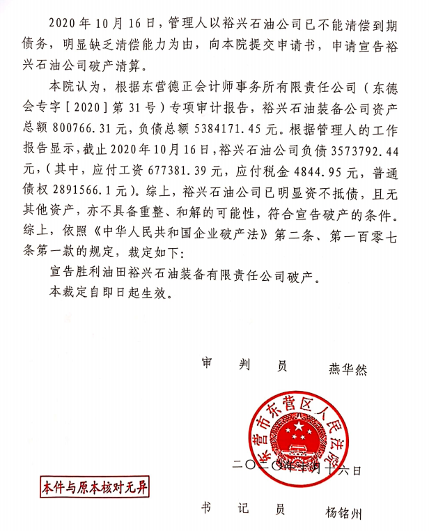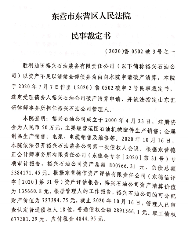 胜利油田裕兴石油装备有限责任公司宣告破产——民事裁定书