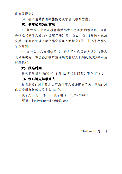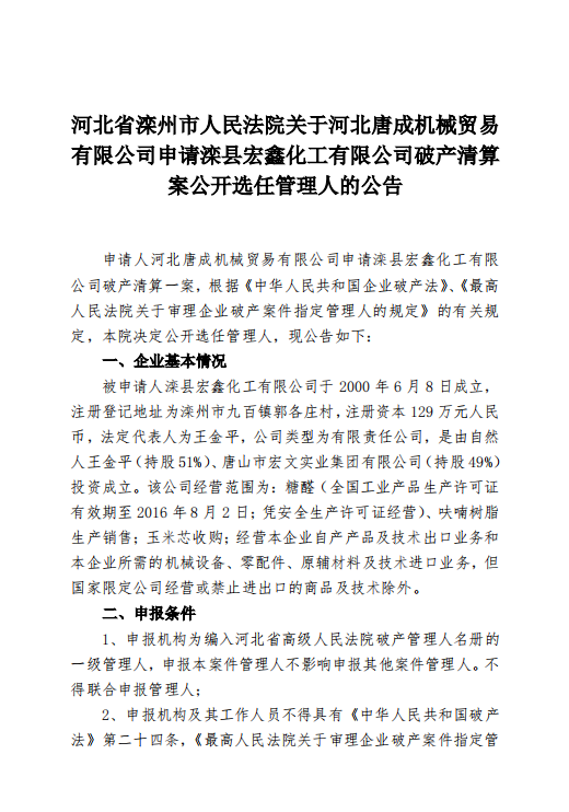 关于河北唐成机械贸易有限公司申请滦县宏鑫化工有限公司破产清算案 公开选任管理人的公告