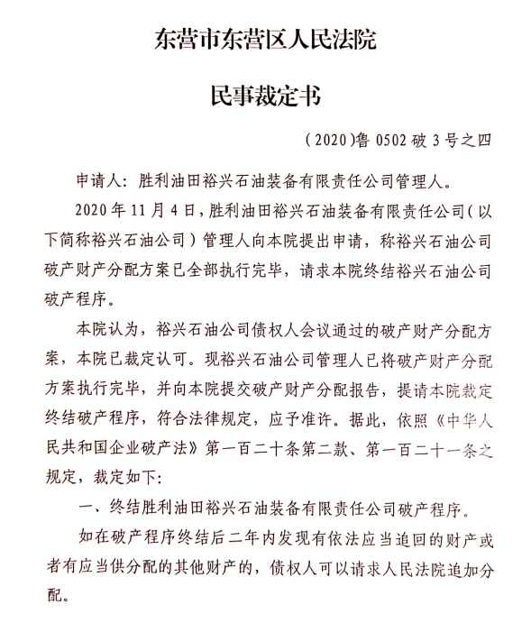 终结胜利油田裕兴石油装备有限责任公司破产程序——民事裁定书