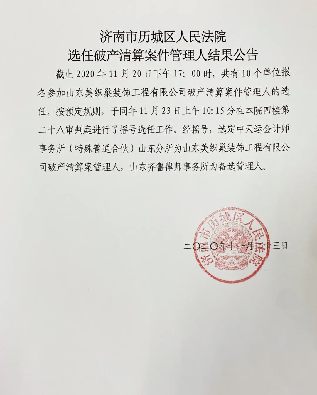 截止2020年11月20日下午17:00时,共有10个单位报名参加山东美织巢装饰工程有限公司破产清算案件管理人的选任,按预定规则,于同年11月23日上午10:15分在本院四楼第二十八审判庭进行了摇号选任工作。经摇号,选定中天运会计师事务所(特殊普通合伙)山东分所为山东美织巢装饰工程有限公司破产清算案管理人,山东齐鲁律师事务所为备选管理人。
