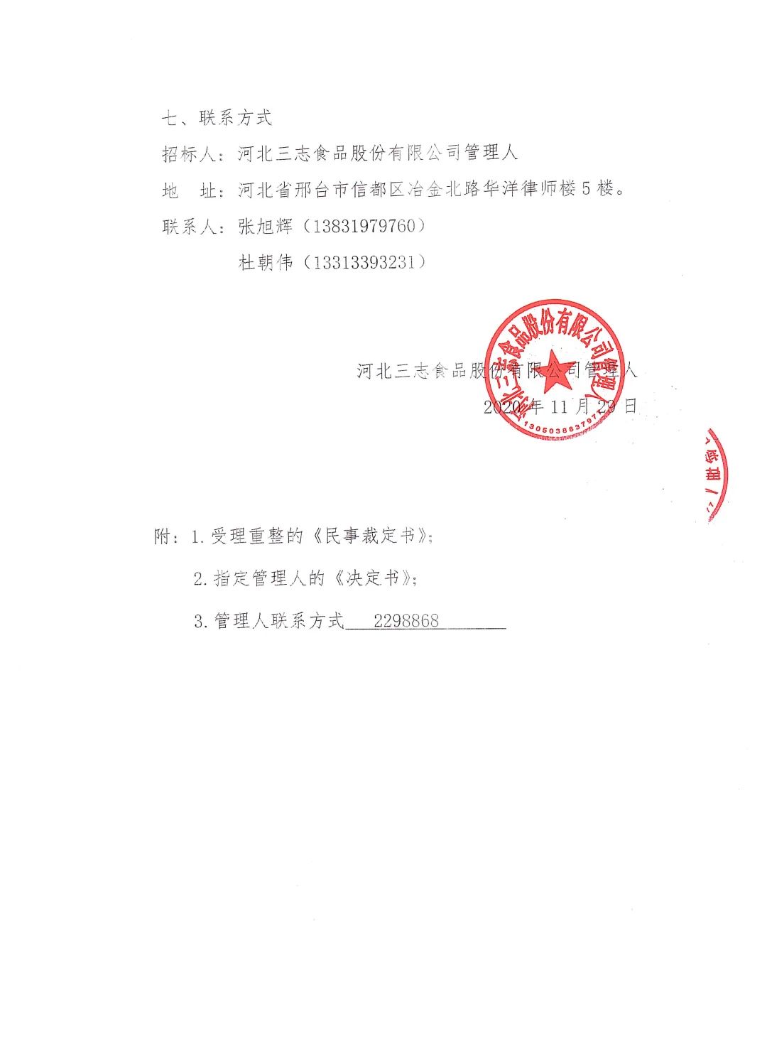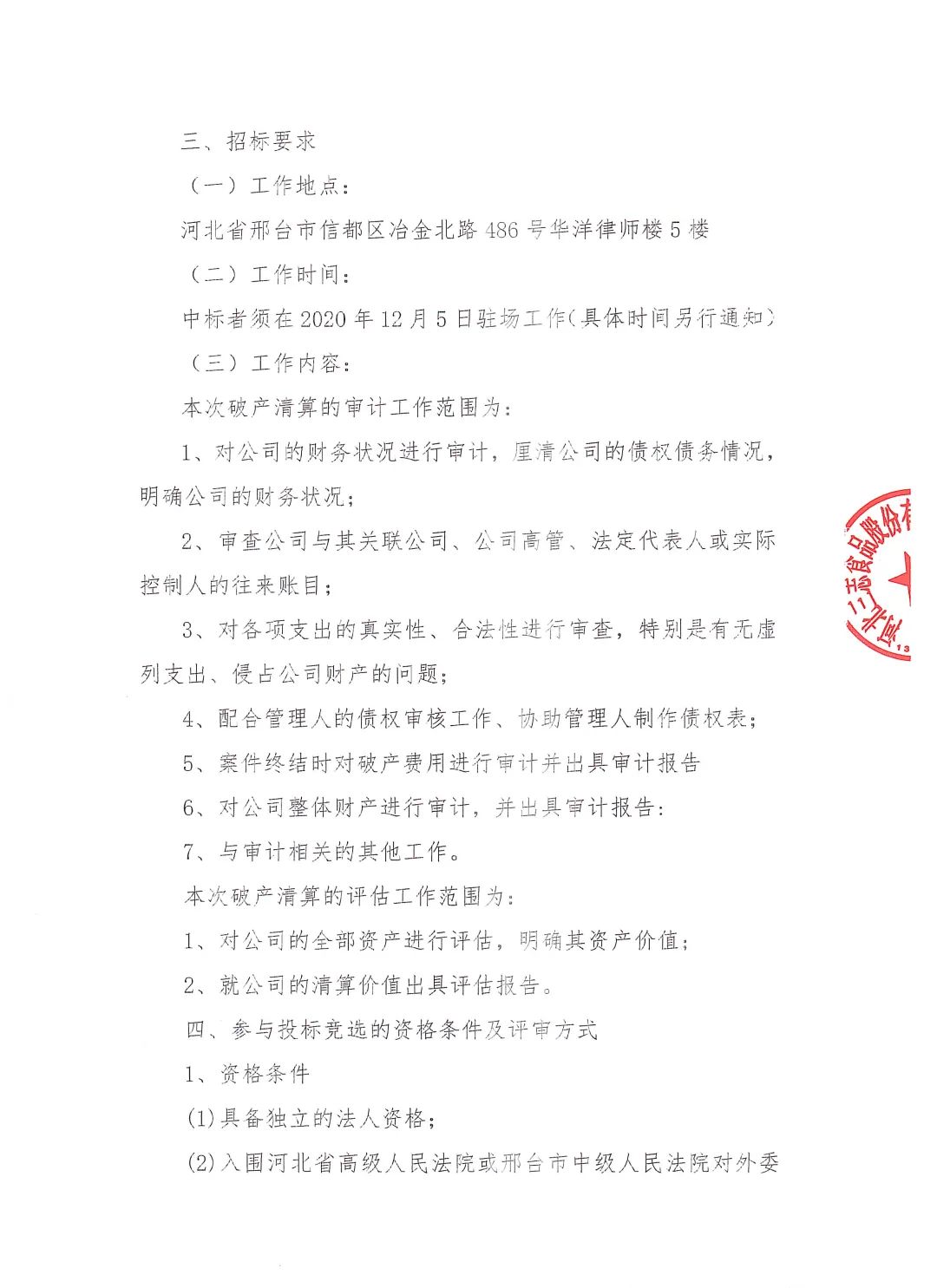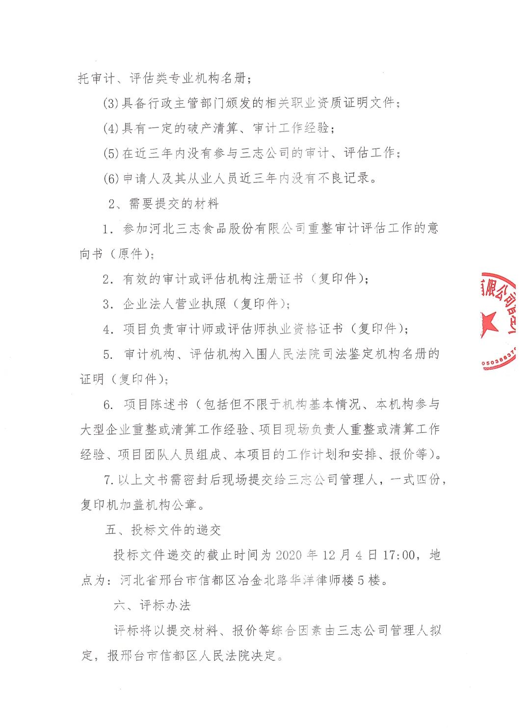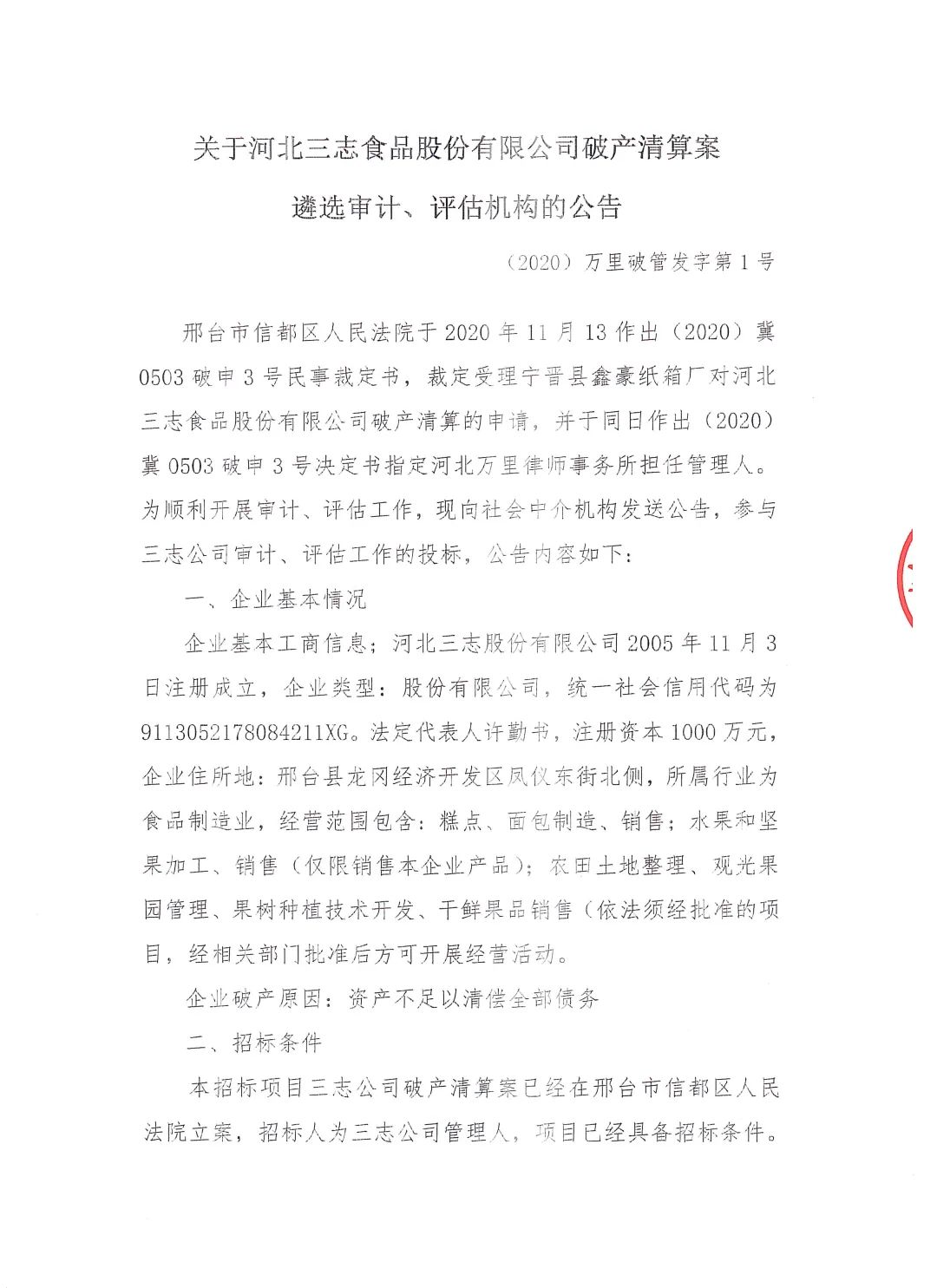关于河北三志食品股份有限公司破产清算案 遴选审计、评估机构的公告