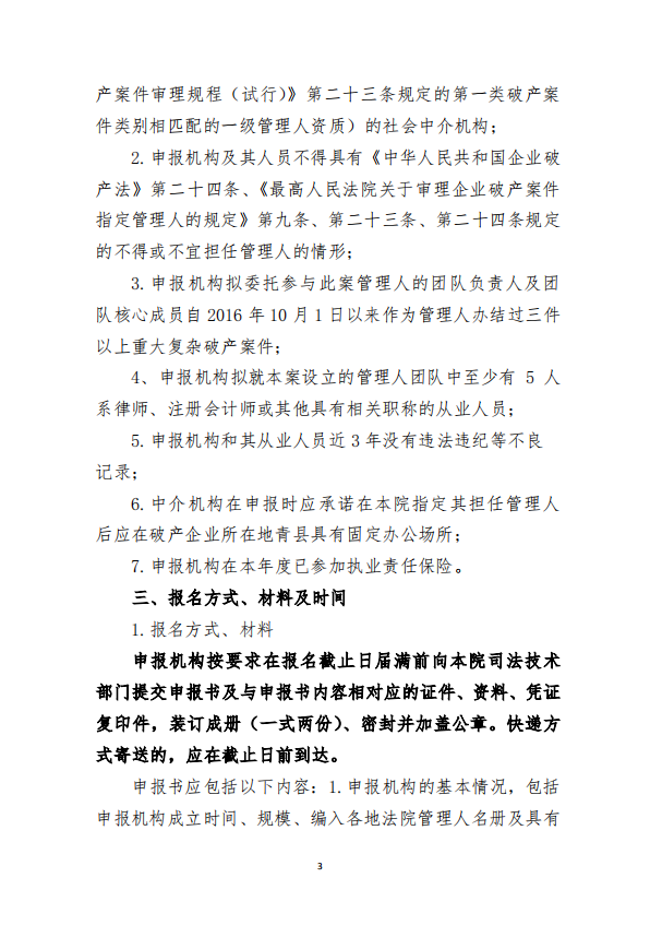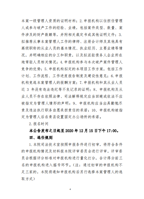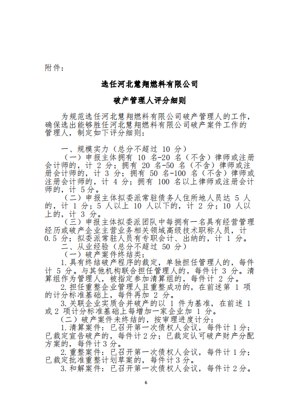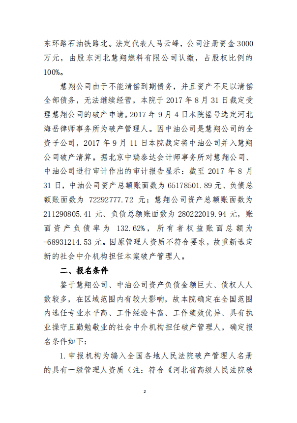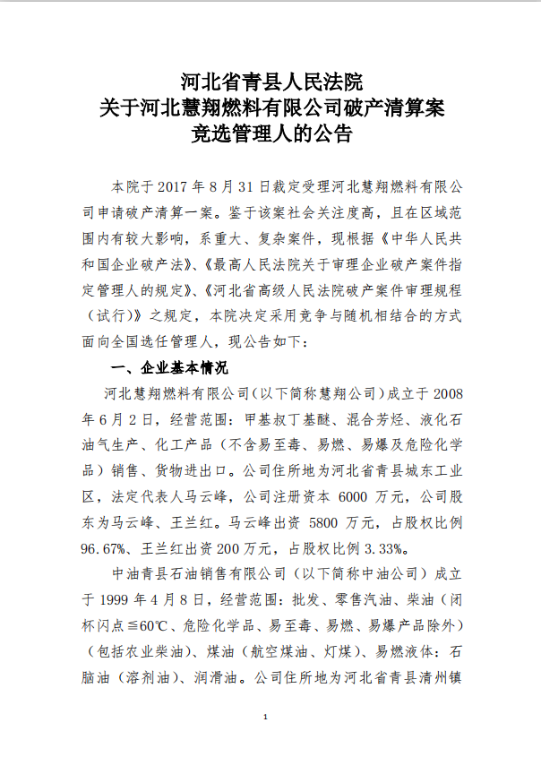 关于河北慧翔燃料有限公司破产清算案 竞选管理人的公告