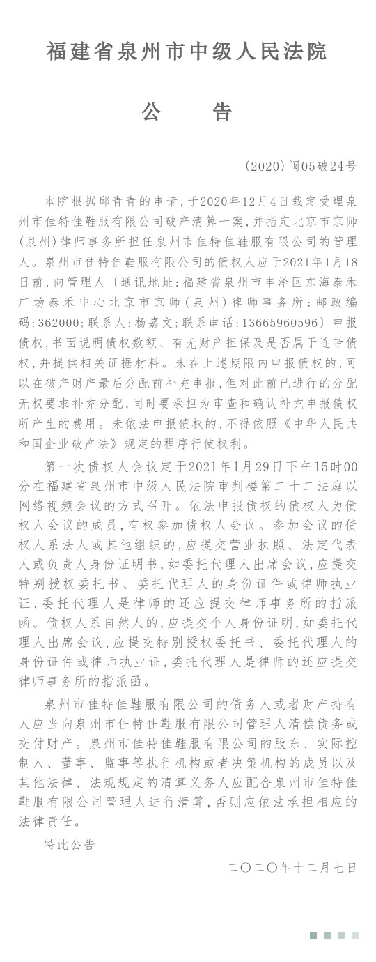 泉州市佳特佳鞋服有限公司破产清算一案公告
