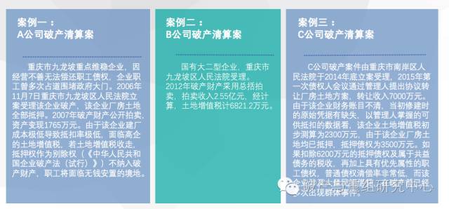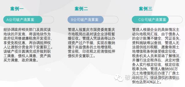 案例二(管理人应对方案):管理人报重庆市国资委商重庆市地税局出函对该企业涉税暂缓征收。管理人凭该函得以办理资产过户手续,实现在缴纳属于共益债务的土地增值税,营业税,印花税之前清偿抵押债权并安置职工。