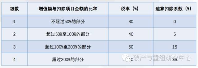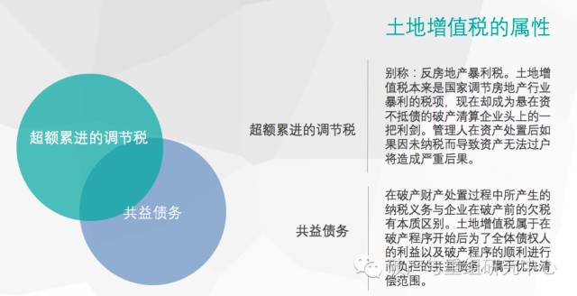 超额累进的调节税。别称:反房地产暴利税。土地增值税本来是国家调节房地产行业暴利的税项,现在却成为悬在资不抵债的破产清算企业头上的一把利剑。管理人在资产处置后如果因未纳税而导致资产无法过户将造成严重后果。