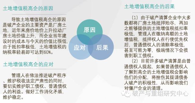 导致土地增值税高企的原因是破产企业的主要资产是厂房土地,近年来房价地价上升拉动厂房土地价值上升,而企业当年建设时的成本与今天的价值比很低,由于抵扣率极低,土地增值税的纳税率轻易即可达到60%。