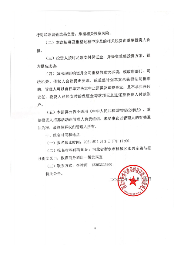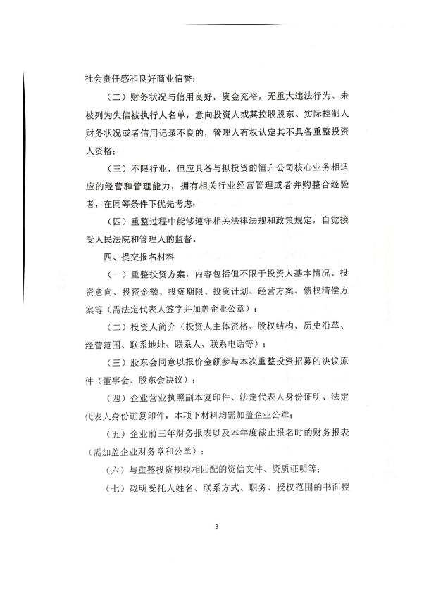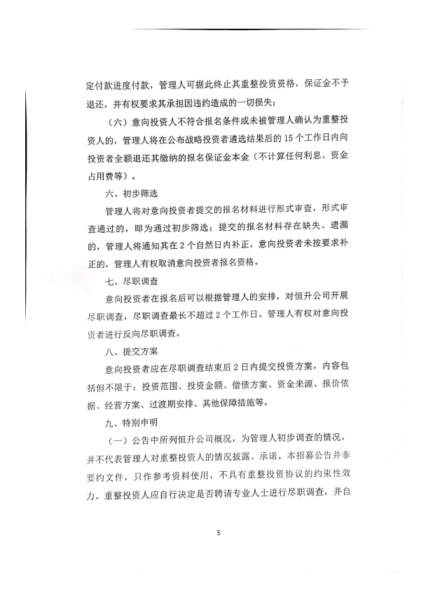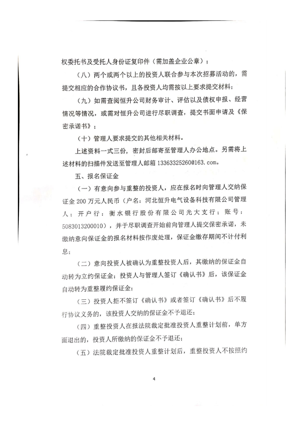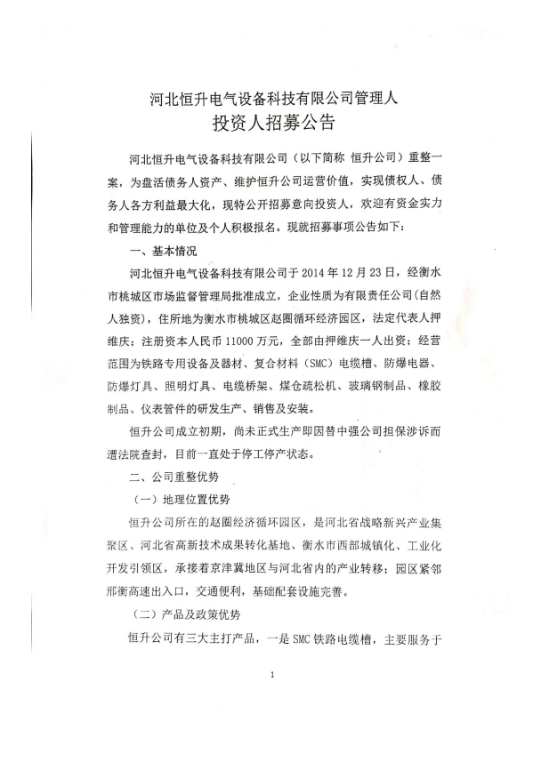 河北恒升电气设备科技有限公司管理人投资人招募公告