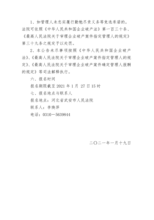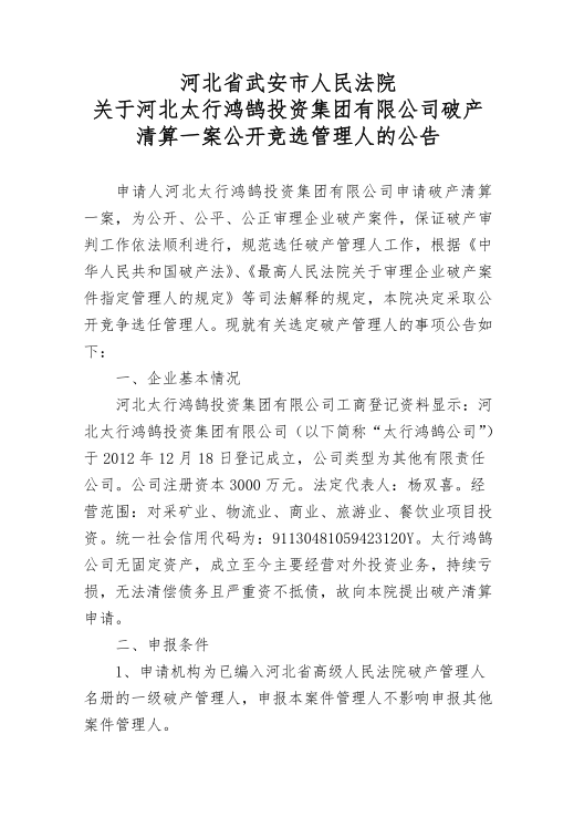 关于河北太行鸿鹄投资集团有限公司破产清算一案 公开竞选管理人的公告