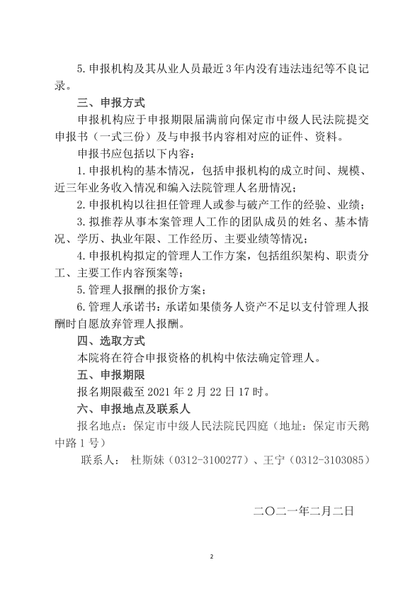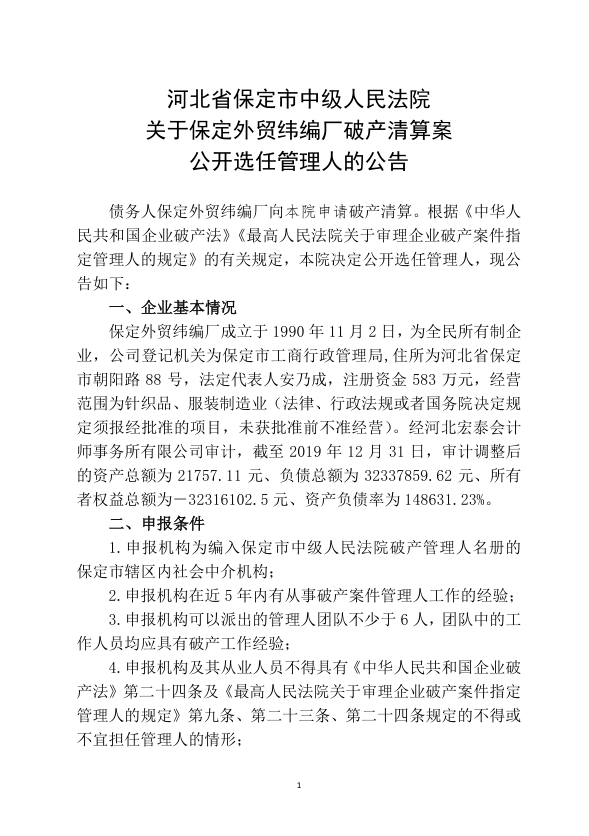 关于保定外贸纬编厂破产清算案 公开选任管理人的公告