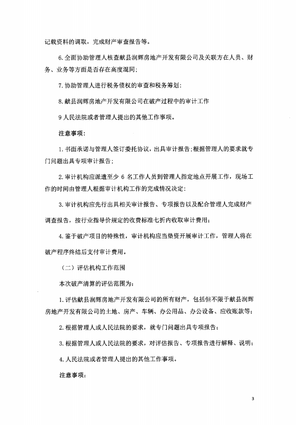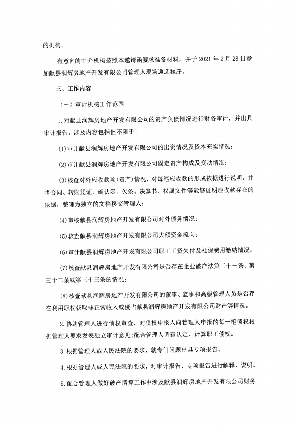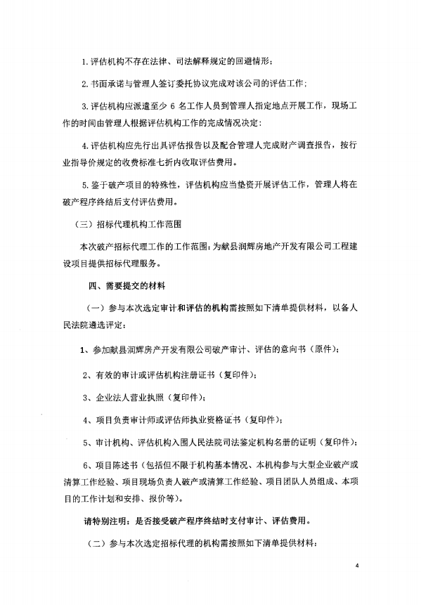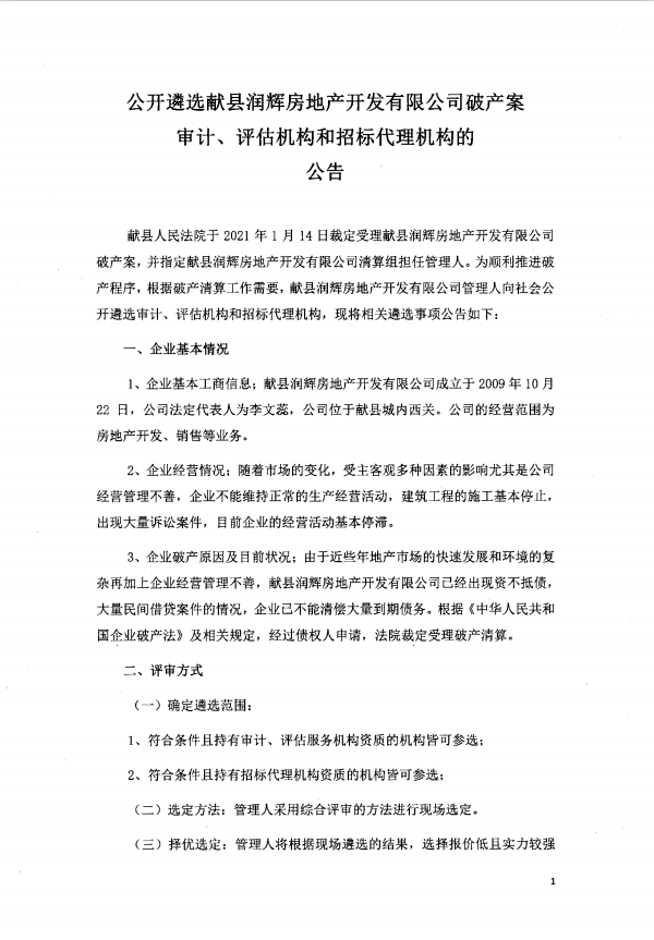 公开遴选献县润辉房地产开发有限公司破产案 审计、评估机构和招标代理机构的公告
