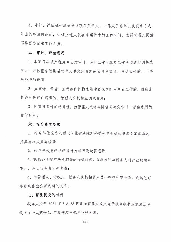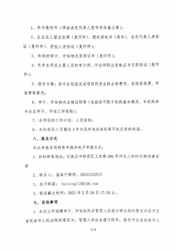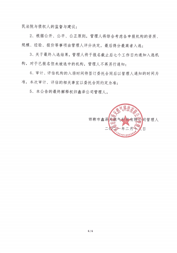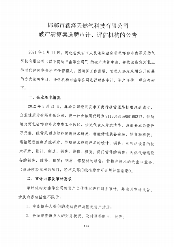 邯郸市鑫泽天然气科技有限公司 破产清算案选聘审计、评估机构的公告