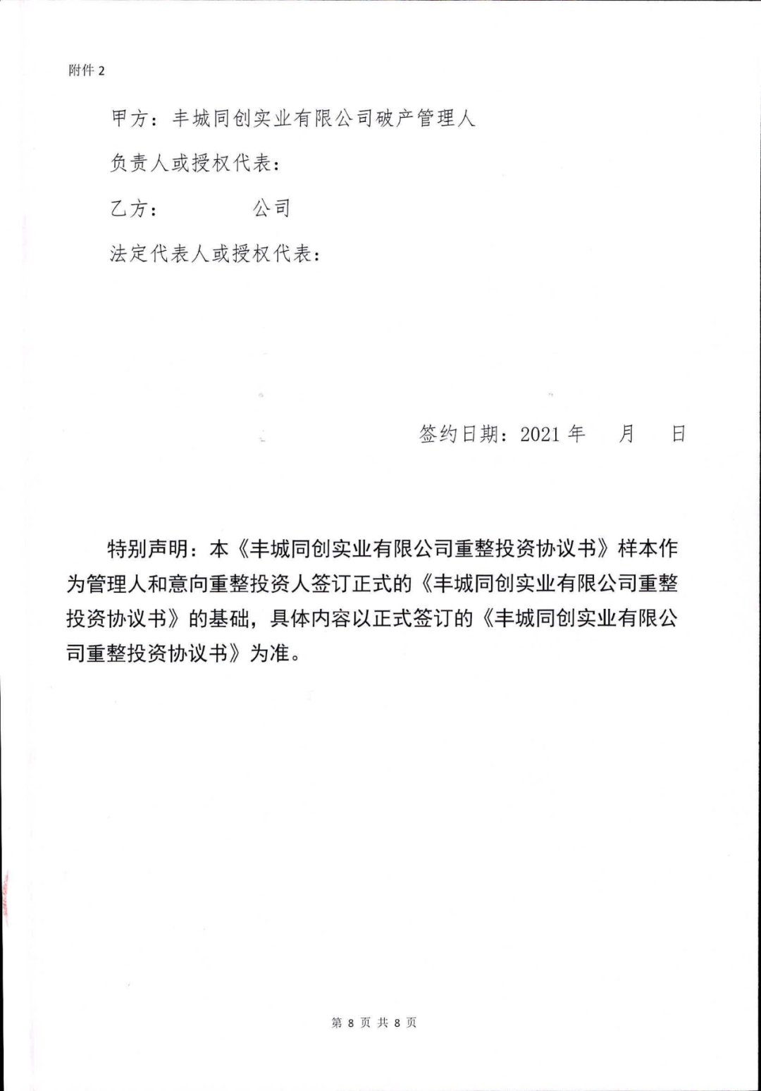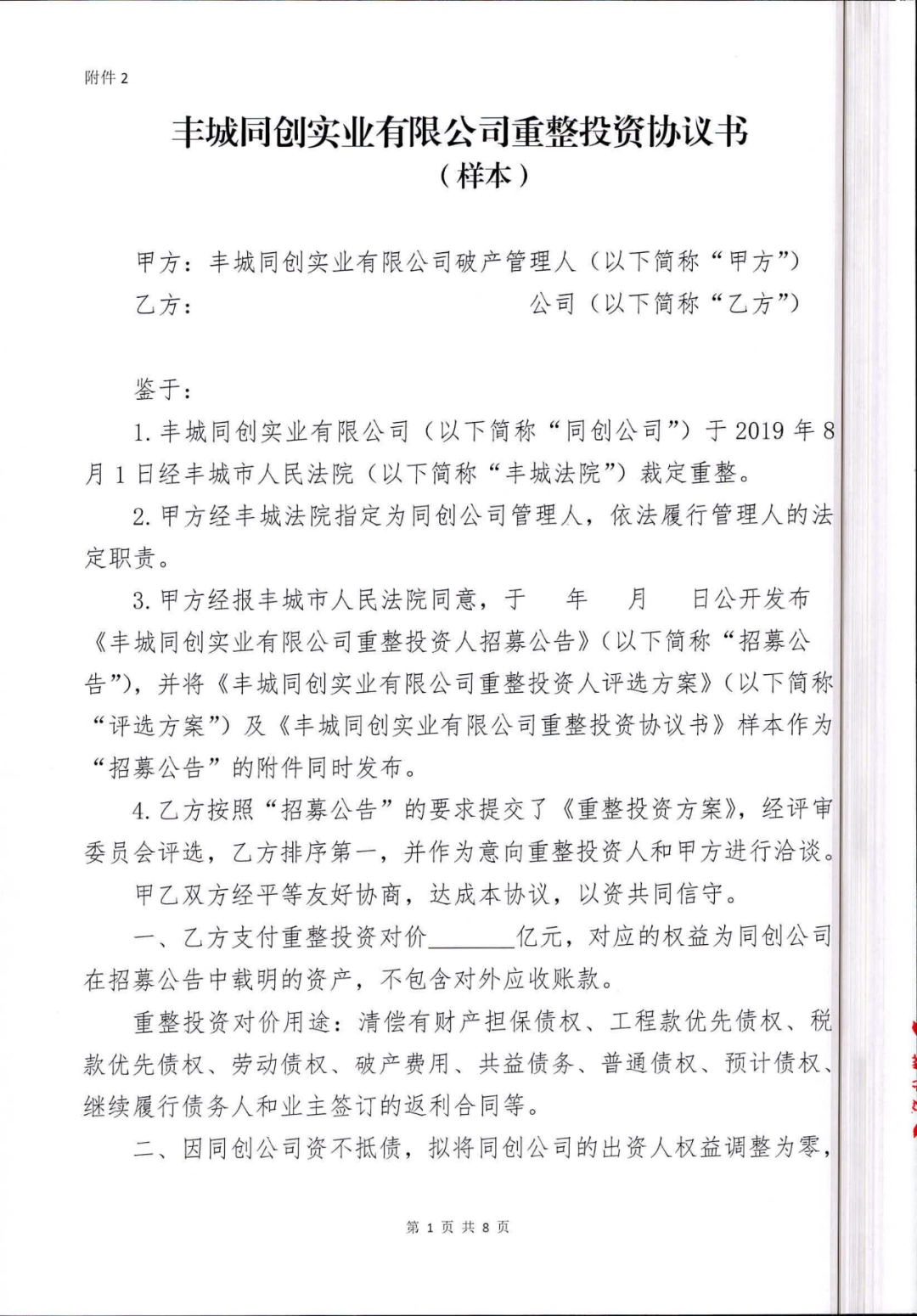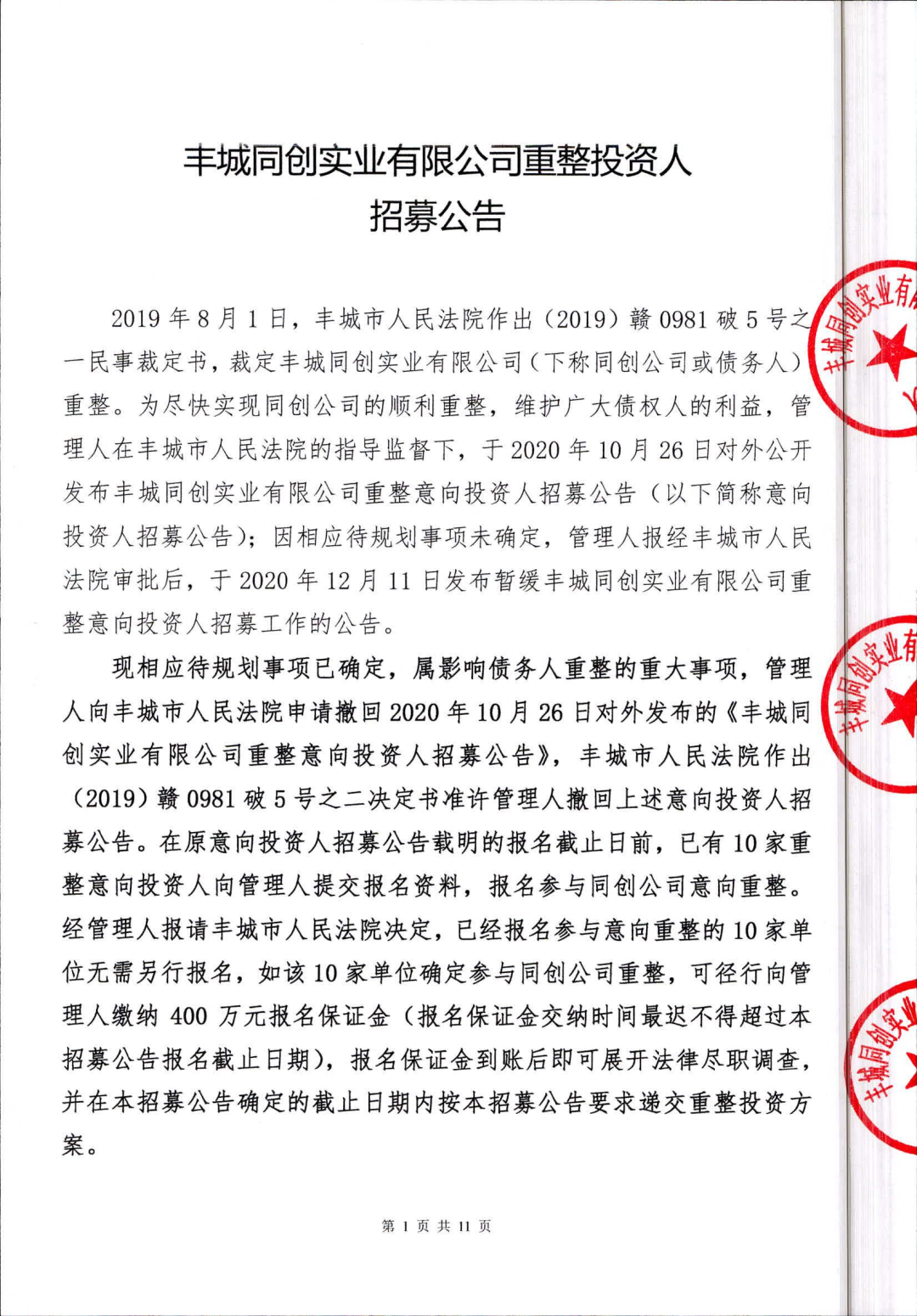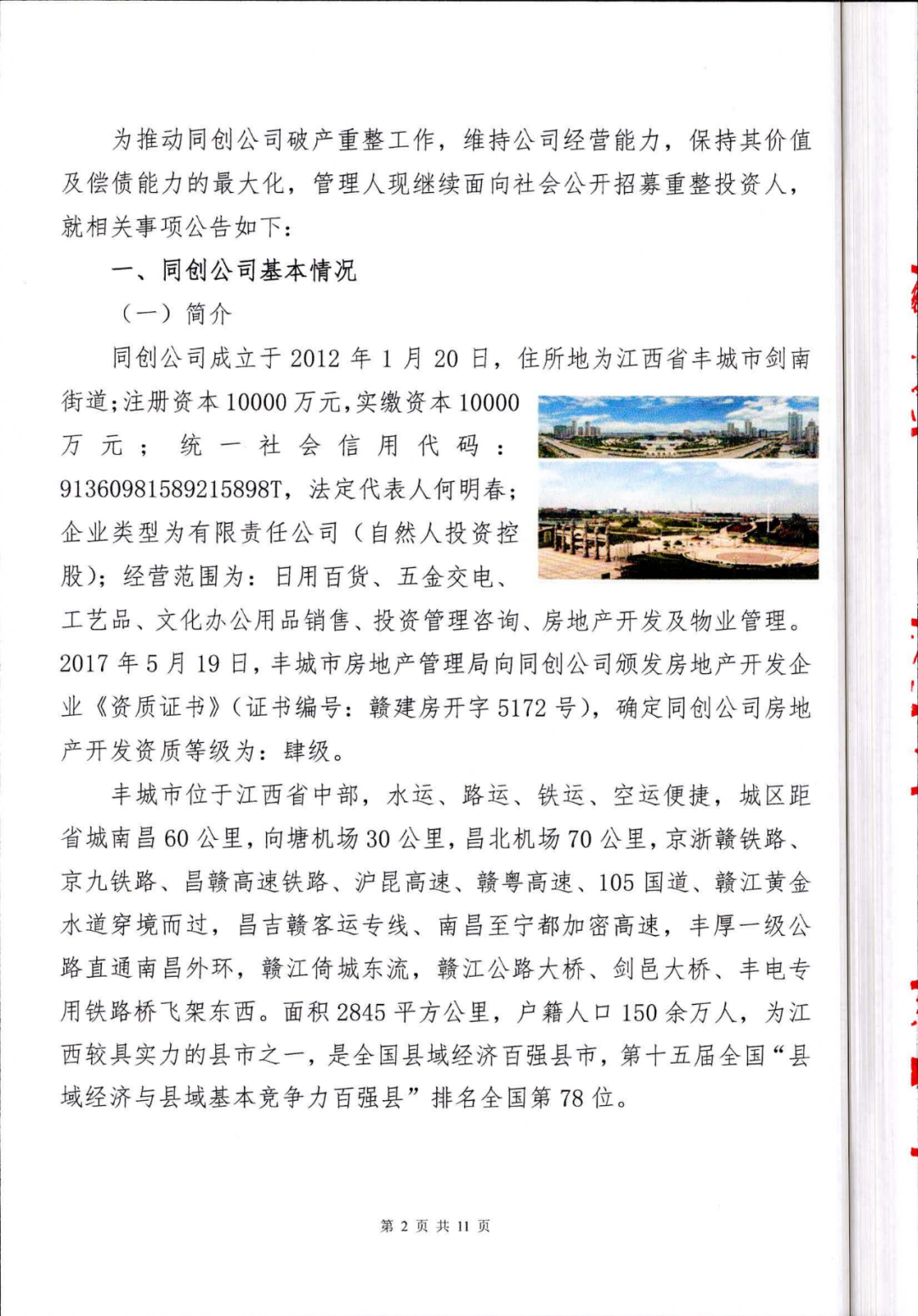 丰城同创实业有限公司重整投资人招募公告