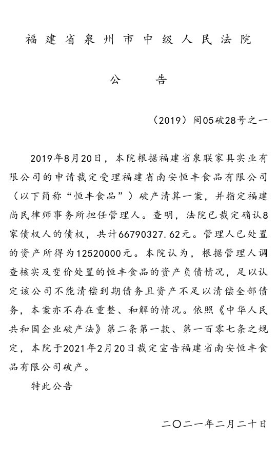 【公告】福建省南安恒丰食品有限公司破产