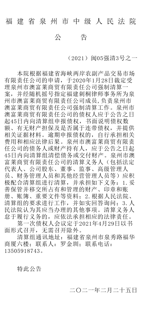 泉州市澳富莱商贸有限责任公司强制清算案裁定公告