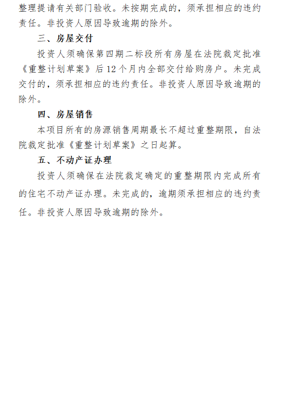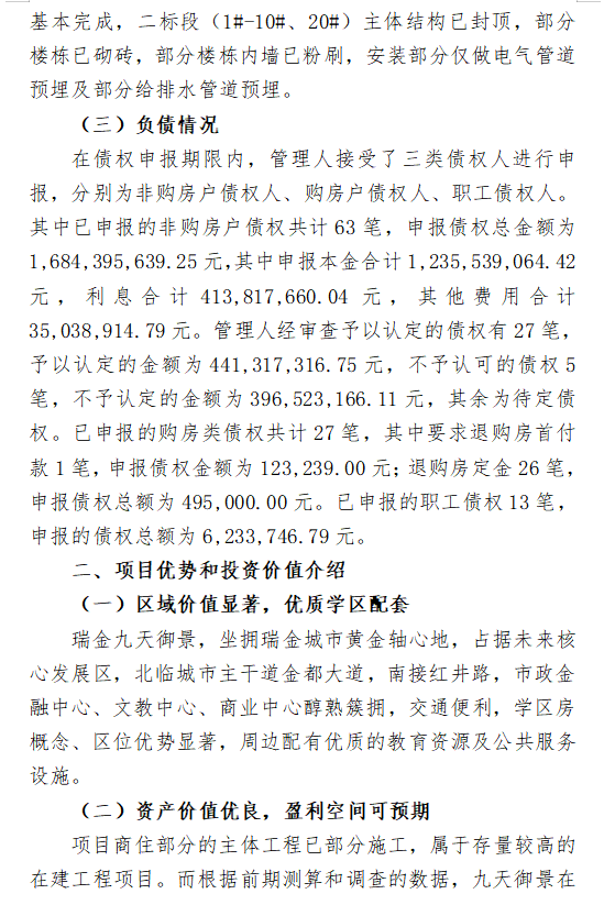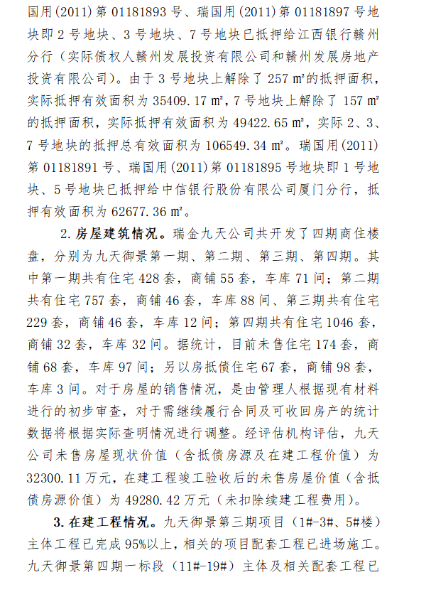 (一)瑞金九天公司开发的“九天御景”项目第一期、第二期已达到交付条件且大部分已交付。第三期、第四期一标段在管理人接管瑞金九天公司后已相继恢复施工且已基本完成工程建设,重整投资人主要投资的项目范围为第四期第二标段工程的继续建设,同时需对“九天御景”项目房屋销售、房屋交付、不动产办证等全部开发人义务承担责任。