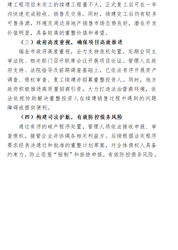 (三)考虑到瑞金九天公司历史遗留问题复杂,在复工续建、抵债房清退、竣工验收、交房办证、税收征缴等方面均存在较多不确定性,意向投资人可根据项目现状向管理人、相关部门及专业机构咨询,但仅作为意向投资人开展重整投资判断的参考,不作为决策依据。意向投资人可自行勘察项目现场,充分考虑相关事项的风险。