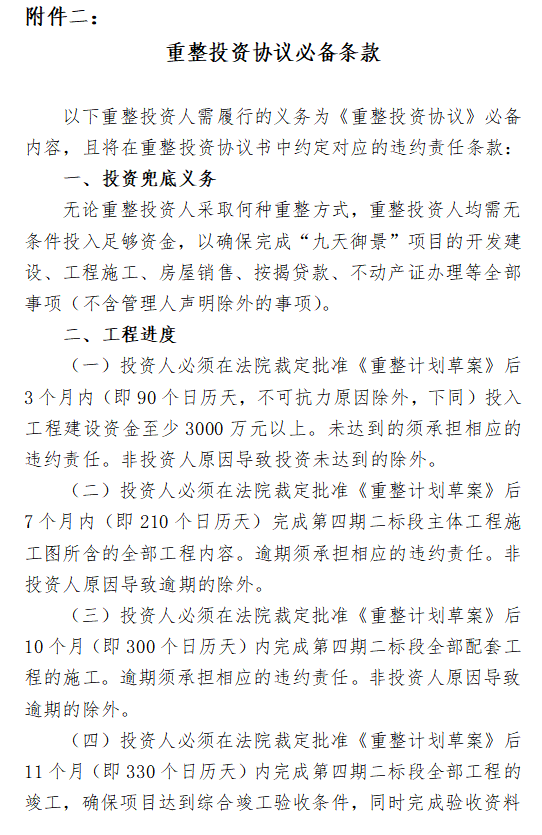 3.对于最终入选且与管理人正式签署《重整投资协议》的重整投资人,已缴纳的投资保证金将转化为《重整投资协议》的履约保证金(不计息),待九天御景项目全部工程竣工验收完毕后七个工作日内无息退还。在债权人会议通过重整计划草案后,投资人需按约履行义务,接受管理人监督。