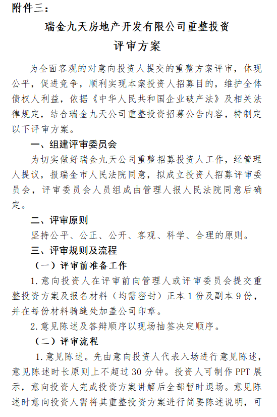 附件三:瑞金九天房地产开发有限公司重整投资评审方案