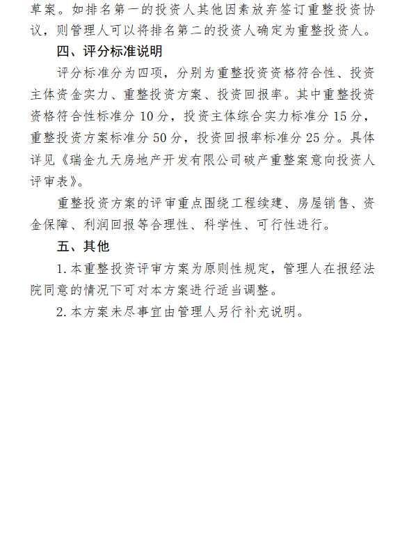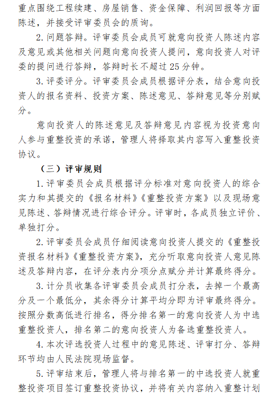 管理人将拟定评审方案和评审规则,在瑞金市人民法院指导和监督下,组织评审委员会对意向投资人提交的《重整投资方案》及所附资料进行评审,根据投资人投资人实力、重整投资经验、履约保障、对价支付、偿债期限、地产开发、工程续建计划、房屋销售方案、购房户权益保护方案、出资人权益调整方案、职工安置方案、激励奖惩机制等因素,根据得分高低,遴选确定瑞金九天公司的一名中选重整投资人和一名备选重整投资人。管理人根据评审结果向两位意向投资人发送《中选资格确认书》或《备选资格确认书》和《重整投资协议》。评审遴选的具体时间由管理人另行通知。在招募期间,如仅有一家意向投资人提交报名材料及重整方案,且符合本公告要求的重整投资人条件的,则该意向投资人即为中选重整投资人,管理人仍可与该重整投资人就重整投资方案进行协商。