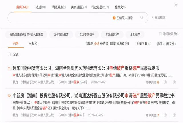 以近三年长沙市中级人民法院的破产申请案件为例(共计448起破产申请案件,检索时间为2020年11月8日,见下图),剔除掉其中撤回申请的案件52起,法院作出其他裁定的案件共计396起。