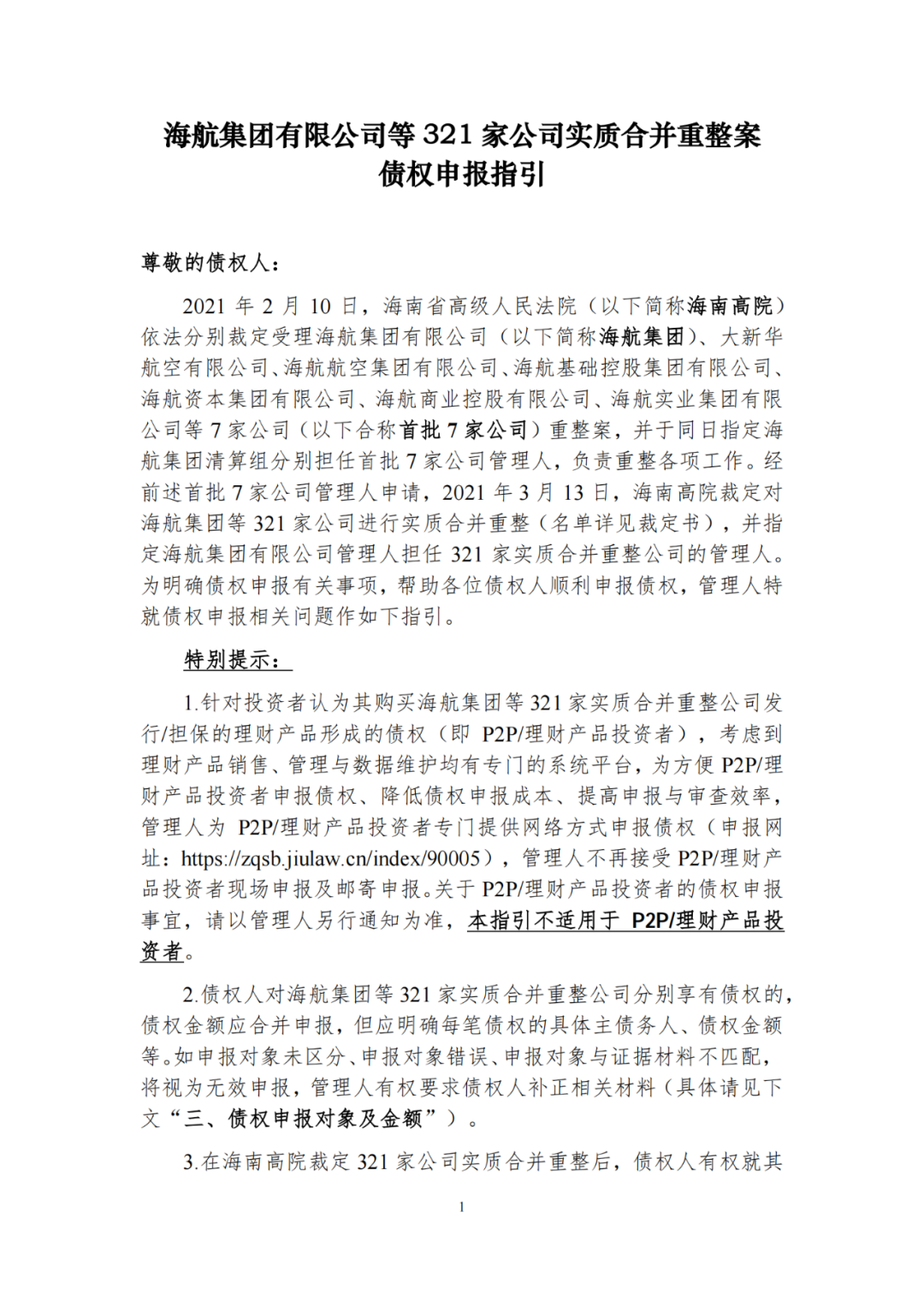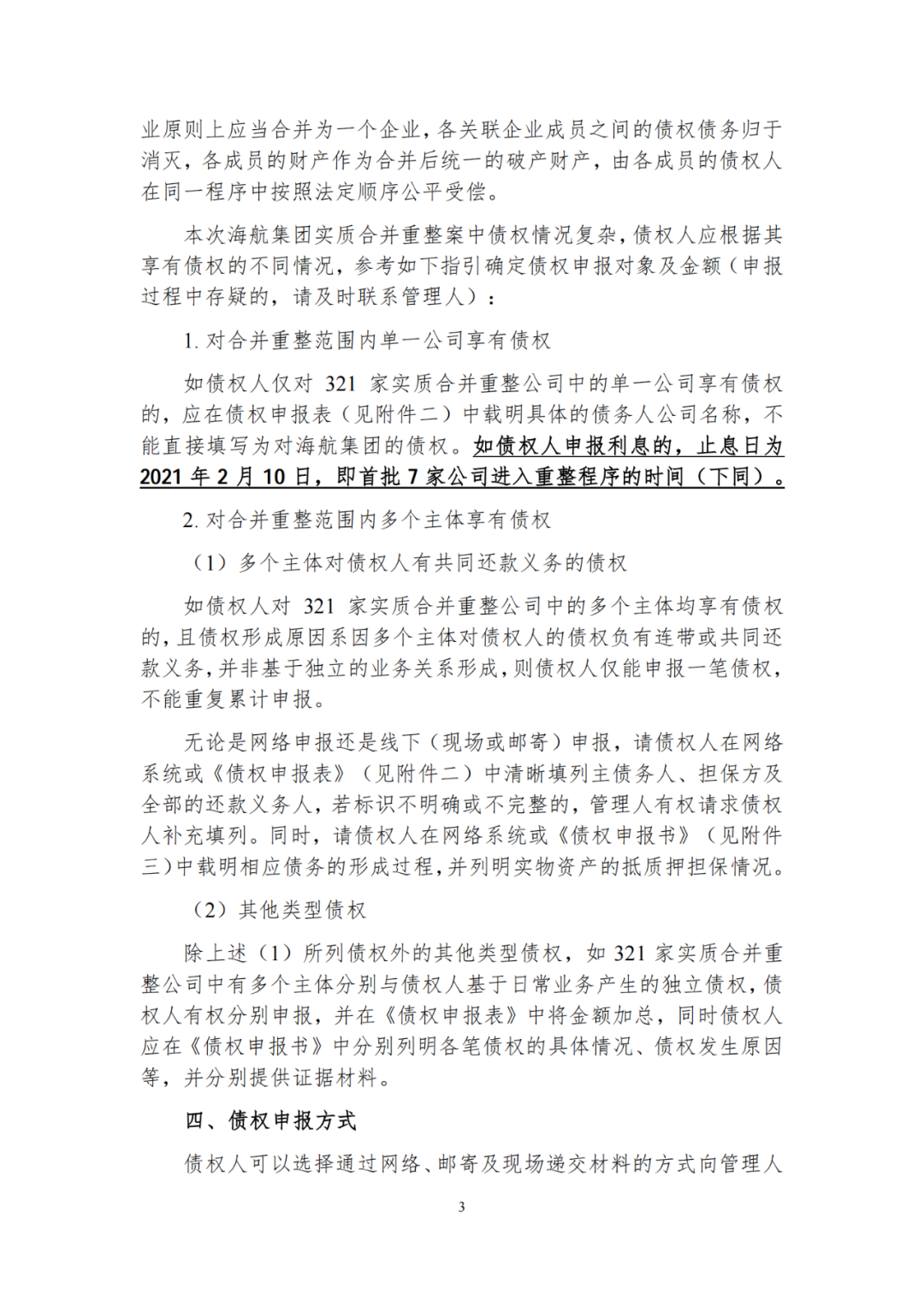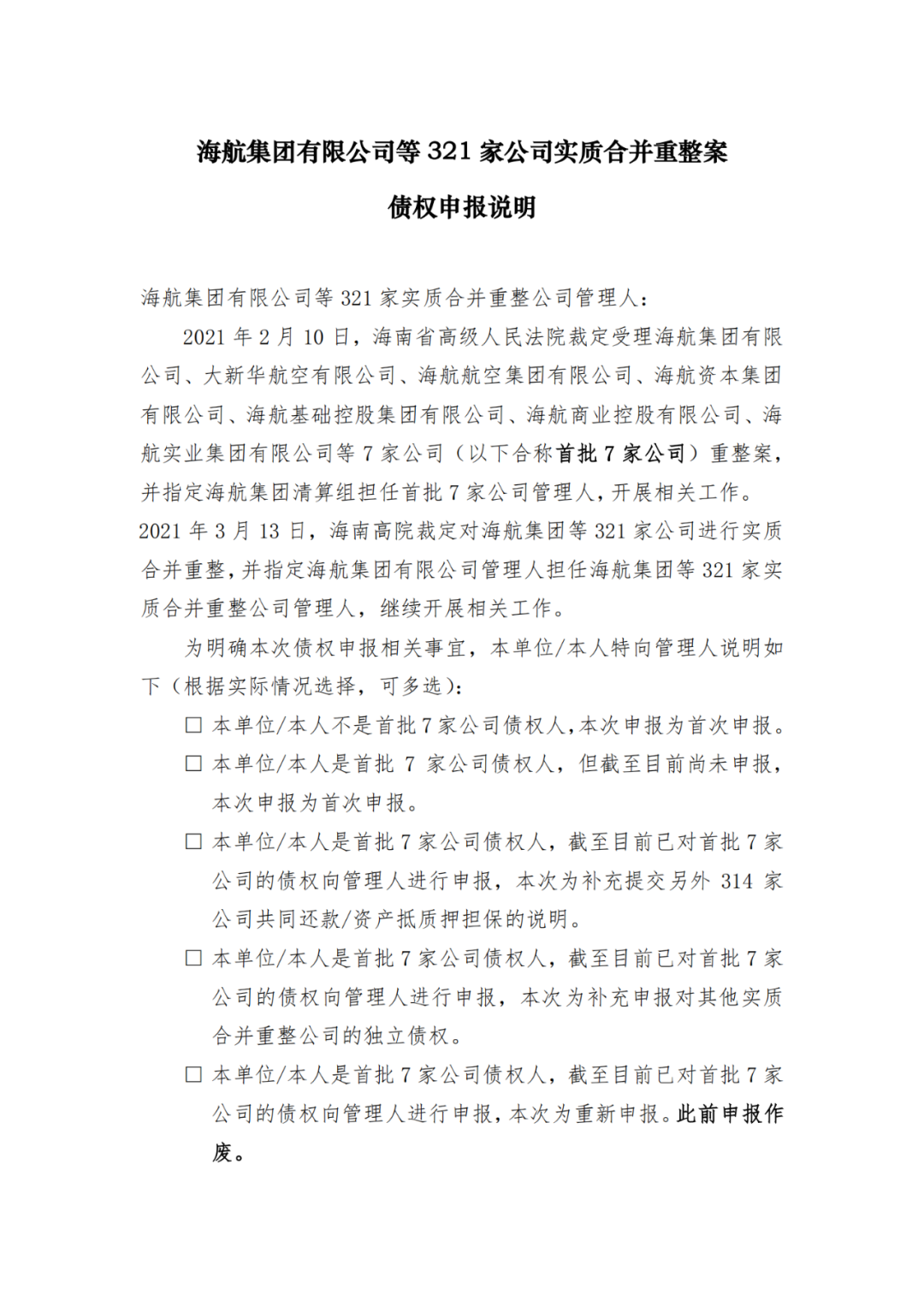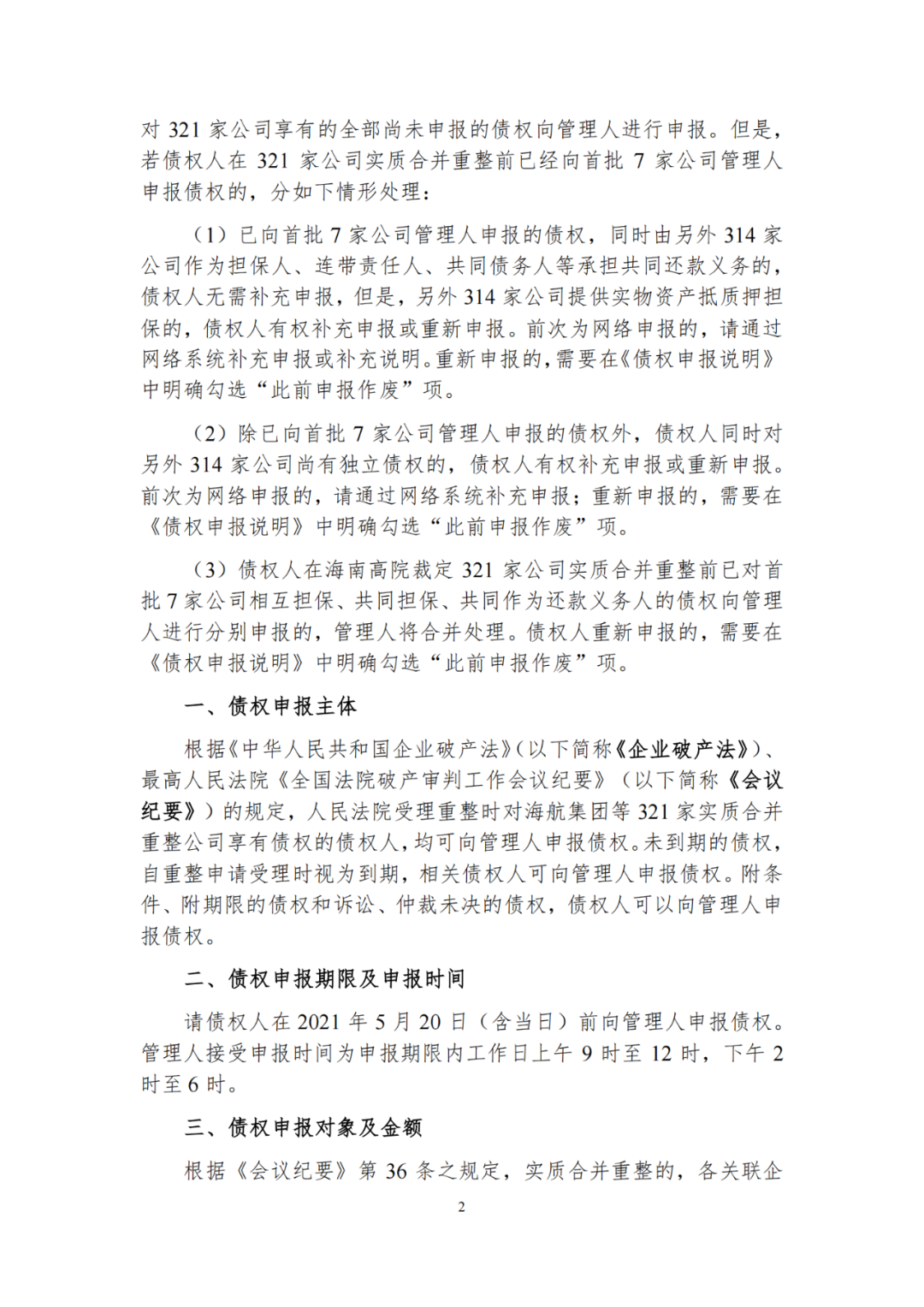 本院根据海航集团有限公司管理人、海航航空集团有限公司管理人、大新华航空有限公司管理人、海航资本集团有限公司管理人、海航基础控股集团有限公司管理人、海航商业控股有限公司管理人、海航实业集团有限公司管理人的申请,于2021年3月13日依法裁定对海航集团有限公司等321家公司(具体名单详见附件1)进行实质合并重整,并于同日指定海航集团有限公司管理人担任海航集团等321家公司实质合并重整案管理人。有关海航集团有限公司等321家公司财产的保全措施应当解除,执行程序应当中止,债权人可以向管理人申报债权。海航集团有限公司等321家公司的债权人应于2021年5月20日前向管理人(通讯地址:海南省海口市美兰区西沙路25号海航创业园;邮政编码:570102;联系电话详见附件2)申报债权,书面说明债权数额、有无财产担保及是否属于连带债权等情况,并提供相关证据材料,具体申报方式和细节由管理人另行通知。未在前述期限内申报债权的,可以在重整计划草案提交债权人会议讨论前补充申报,但要承担为审查和确认补充申报债权所产生的费用。债权人未依法申报债权的,在重整计划执行期间不得行使权利,在重整计划执行完毕后可以按照重整计划规定的同类债权的清偿条件行使权利。海航集团有限公司等321家公司的债务人或者财产持有人应当向管理人清偿债务或交付财产。本院将在各方配合和支持下,依法开展工作,支持企业正常生产经营,保护各方合法权益。