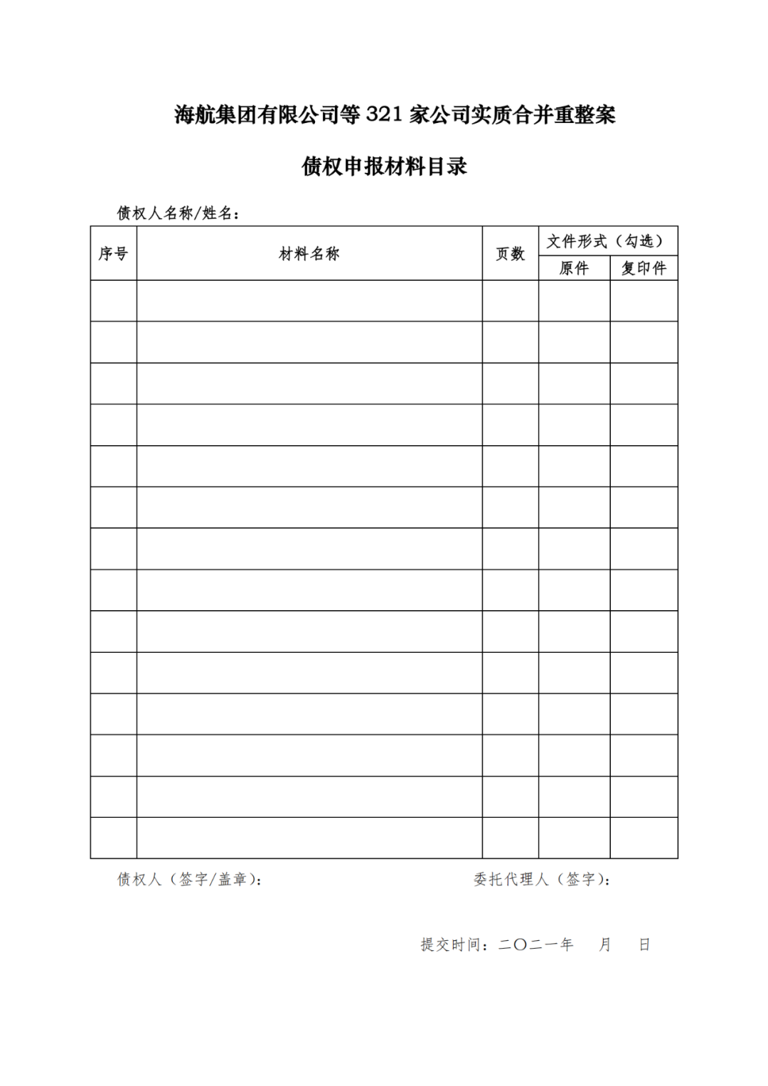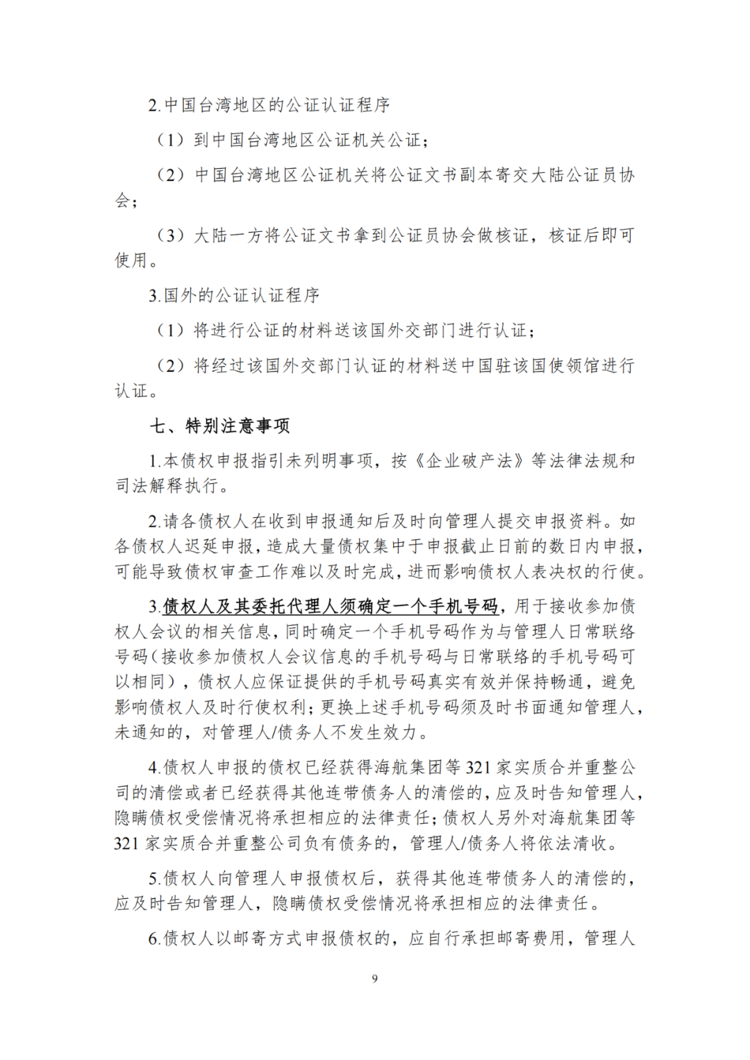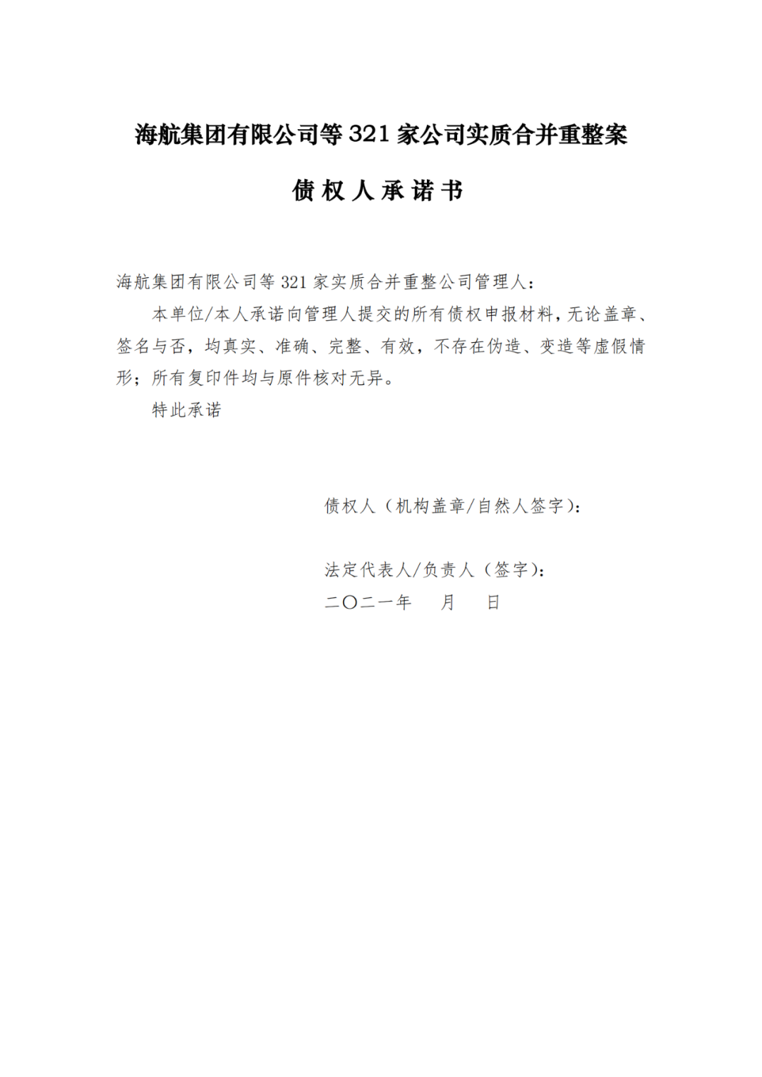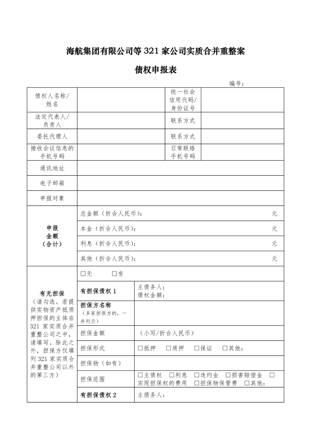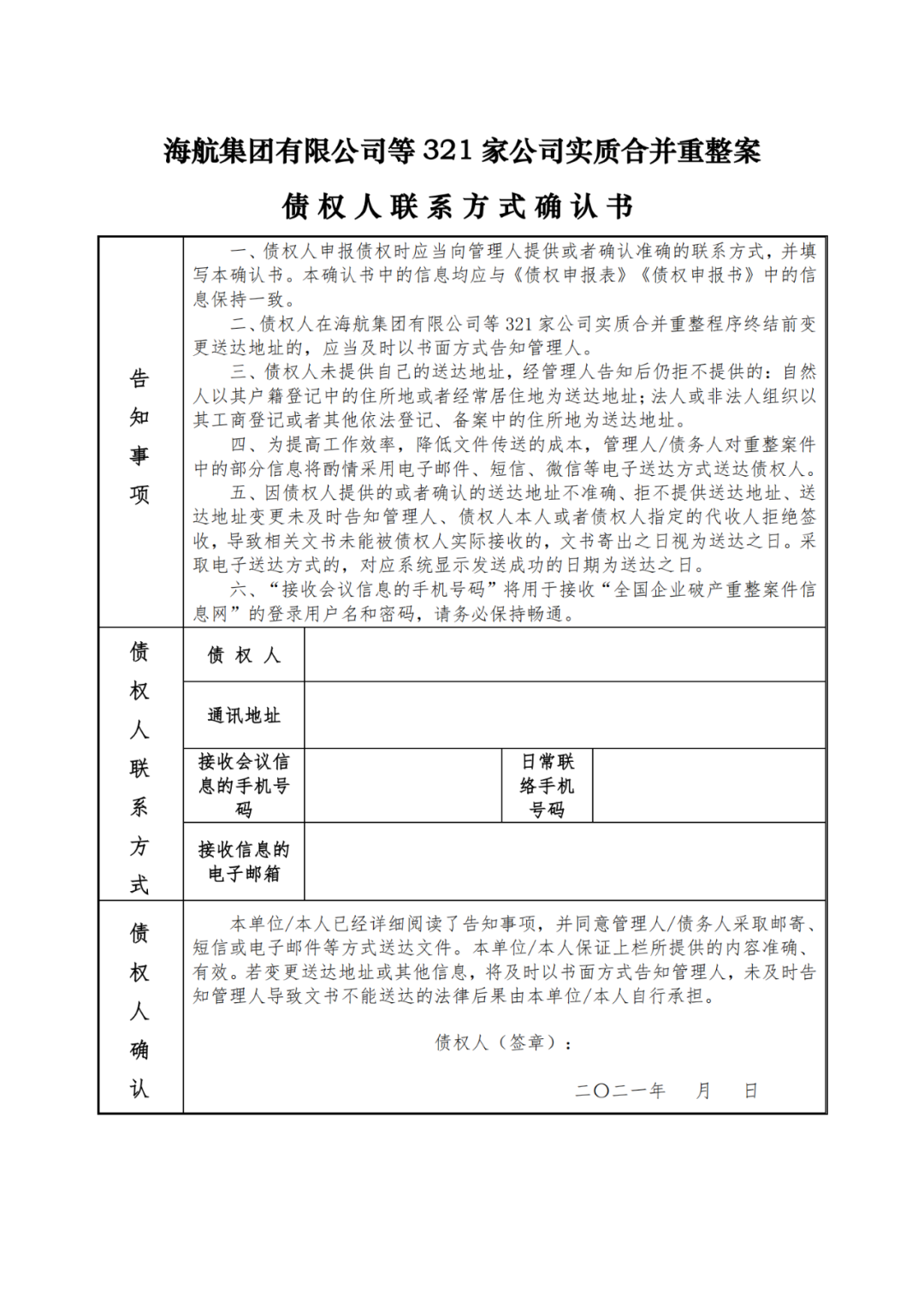 本院根据海航集团有限公司管理人、海航航空集团有限公司管理人、大新华航空有限公司管理人、海航资本集团有限公司管理人、海航基础控股集团有限公司管理人、海航商业控股有限公司管理人、海航实业集团有限公司管理人的申请,于2021年3月13日依法裁定对海航集团有限公司等321家公司(具体名单详见附件1)进行实质合并重整,并于同日指定海航集团有限公司管理人担任海航集团等321家公司实质合并重整案管理人。有关海航集团有限公司等321家公司财产的保全措施应当解除,执行程序应当中止,债权人可以向管理人申报债权。海航集团有限公司等321家公司的债权人应于2021年5月20日前向管理人(通讯地址:海南省海口市美兰区西沙路25号海航创业园;邮政编码:570102;联系电话详见附件2)申报债权,书面说明债权数额、有无财产担保及是否属于连带债权等情况,并提供相关证据材料,具体申报方式和细节由管理人另行通知。未在前述期限内申报债权的,可以在重整计划草案提交债权人会议讨论前补充申报,但要承担为审查和确认补充申报债权所产生的费用。债权人未依法申报债权的,在重整计划执行期间不得行使权利,在重整计划执行完毕后可以按照重整计划规定的同类债权的清偿条件行使权利。海航集团有限公司等321家公司的债务人或者财产持有人应当向管理人清偿债务或交付财产。本院将在各方配合和支持下,依法开展工作,支持企业正常生产经营,保护各方合法权益。