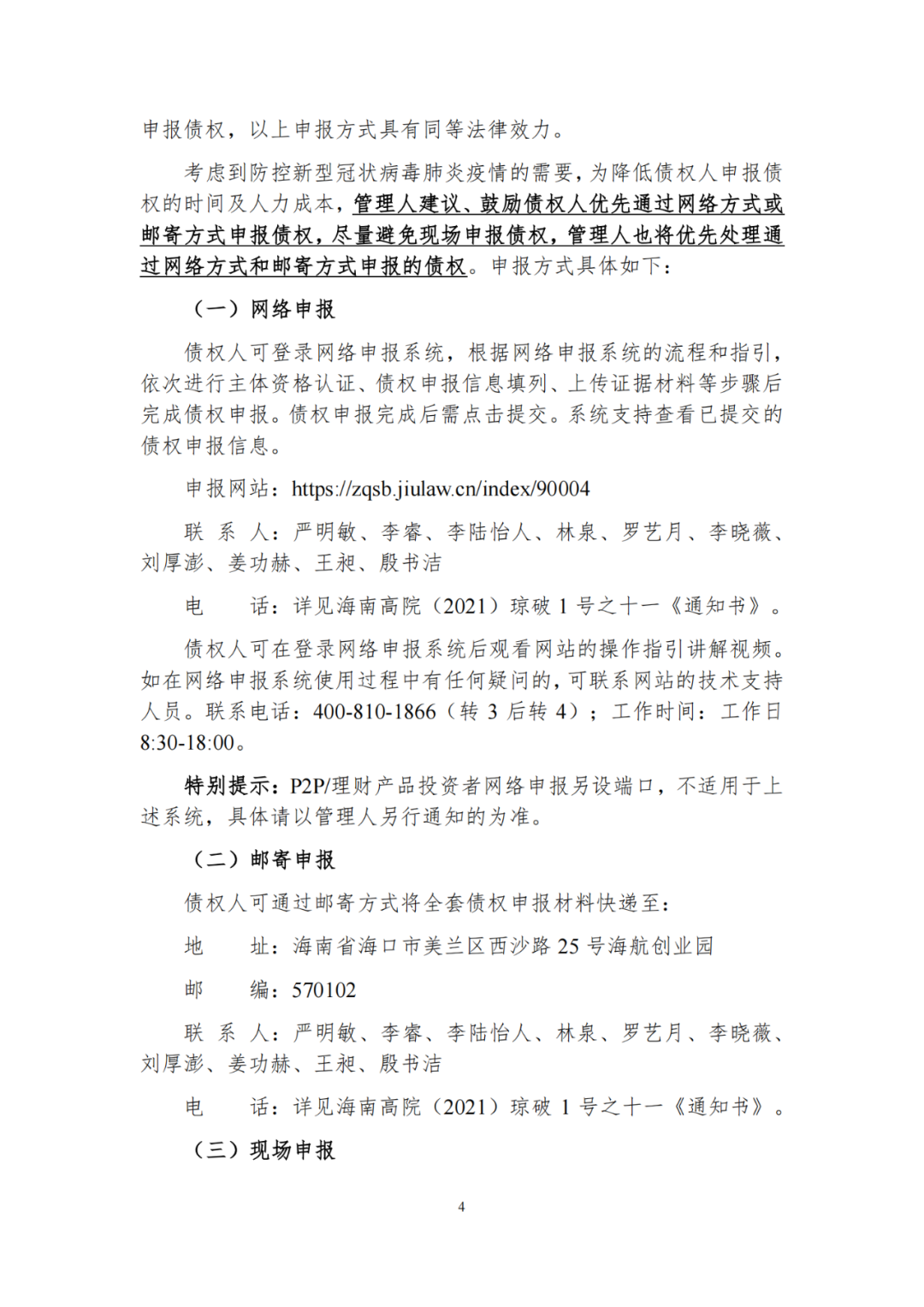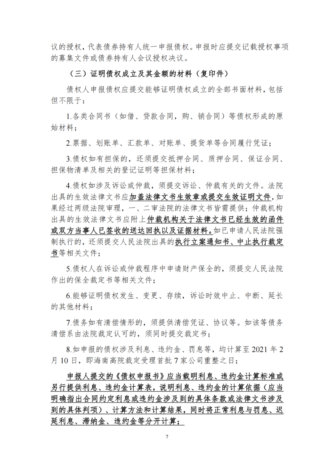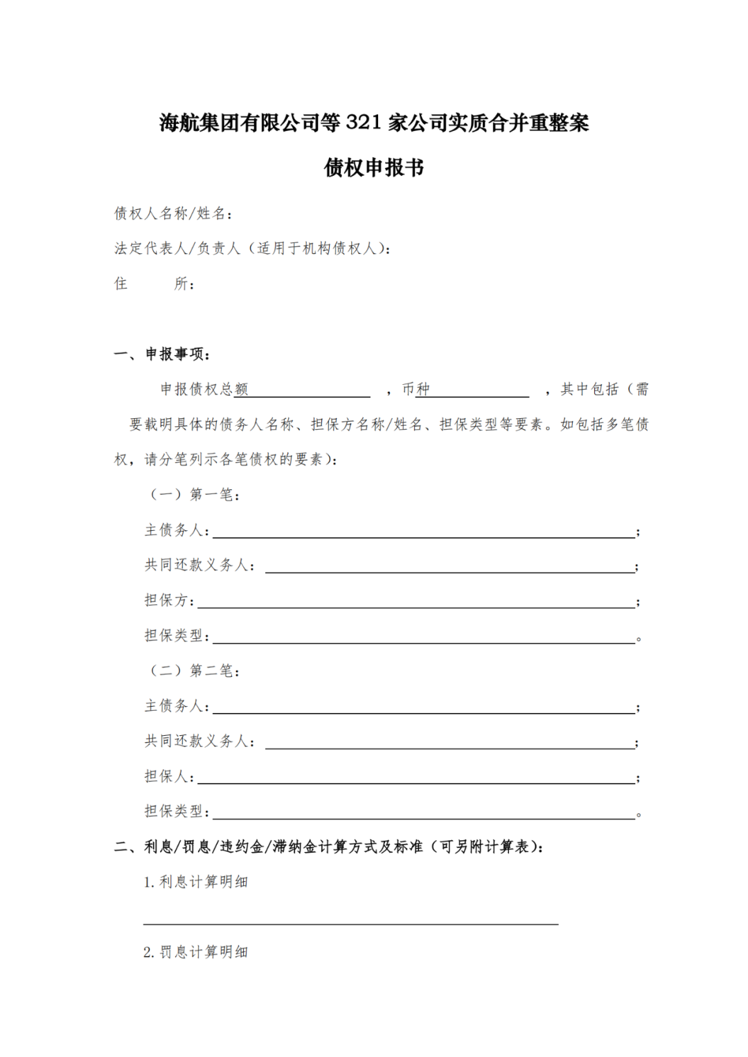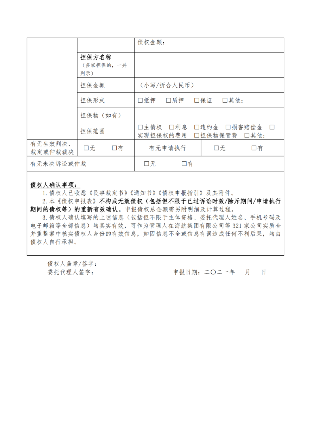 本院根据海航集团有限公司管理人、海航航空集团有限公司管理人、大新华航空有限公司管理人、海航资本集团有限公司管理人、海航基础控股集团有限公司管理人、海航商业控股有限公司管理人、海航实业集团有限公司管理人的申请,于2021年3月13日依法裁定对海航集团有限公司等321家公司(具体名单详见附件1)进行实质合并重整,并于同日指定海航集团有限公司管理人担任海航集团等321家公司实质合并重整案管理人。有关海航集团有限公司等321家公司财产的保全措施应当解除,执行程序应当中止,债权人可以向管理人申报债权。海航集团有限公司等321家公司的债权人应于2021年5月20日前向管理人(通讯地址:海南省海口市美兰区西沙路25号海航创业园;邮政编码:570102;联系电话详见附件2)申报债权,书面说明债权数额、有无财产担保及是否属于连带债权等情况,并提供相关证据材料,具体申报方式和细节由管理人另行通知。未在前述期限内申报债权的,可以在重整计划草案提交债权人会议讨论前补充申报,但要承担为审查和确认补充申报债权所产生的费用。债权人未依法申报债权的,在重整计划执行期间不得行使权利,在重整计划执行完毕后可以按照重整计划规定的同类债权的清偿条件行使权利。海航集团有限公司等321家公司的债务人或者财产持有人应当向管理人清偿债务或交付财产。本院将在各方配合和支持下,依法开展工作,支持企业正常生产经营,保护各方合法权益。
