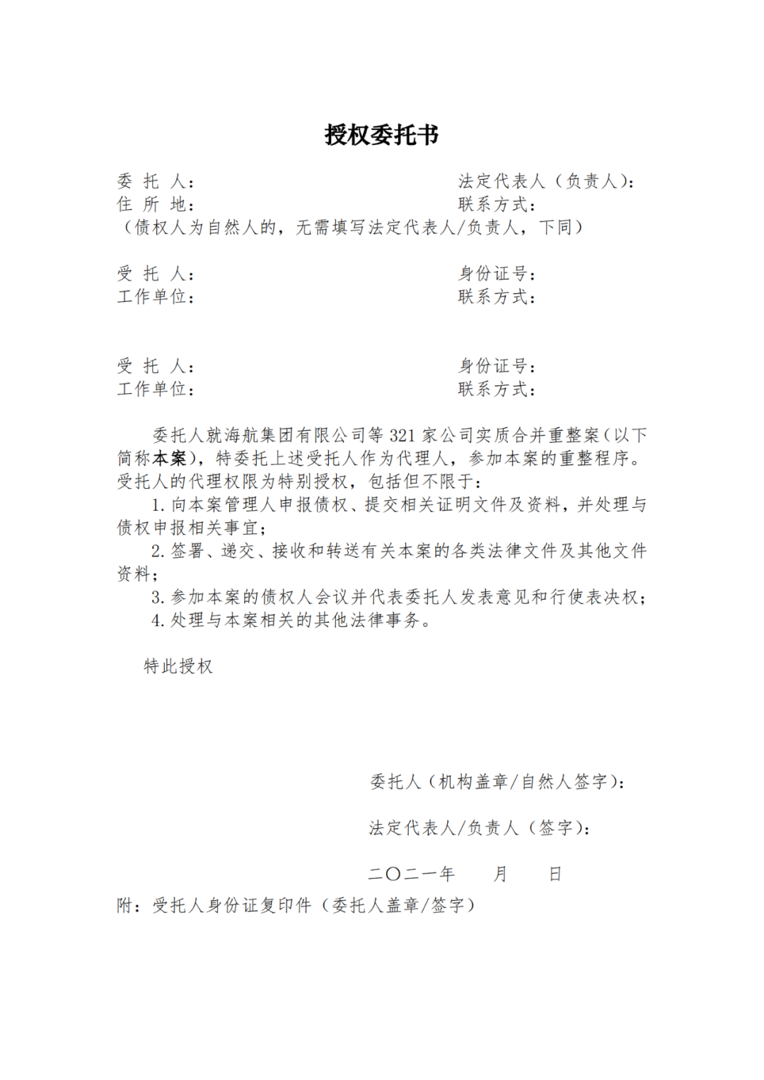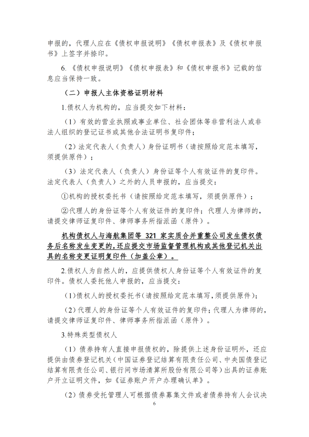海航集团有限公司等321家公司实质合并重整案第一次债权人会议将于2021年6月4日上午9:00在最高人民法院全国企业破产重整案件信息网(http://pccz.court.gov.cn)采取网络方式召开,具体会议细节由管理人另行通知。依法申报债权的债权人为债权人会议的成员,有权参加债权人会议。参加会议的债权人系法人或其他组织的,应提交营业执照、法定代表人或负责人身份证明书,如委托代理人出席会议,应提交特别授权委托书、委托代理人的身份证件或律师执业证,委托代理人是律师的还应提交律师事务所的指派函。债权人系自然人的,应提交个人身份证明,如委托代理人出席会议,应提交特别授权委托书、委托代理人的身份证件或律师执业证,委托代理人是律师的还应提交律师事务所的指派函。