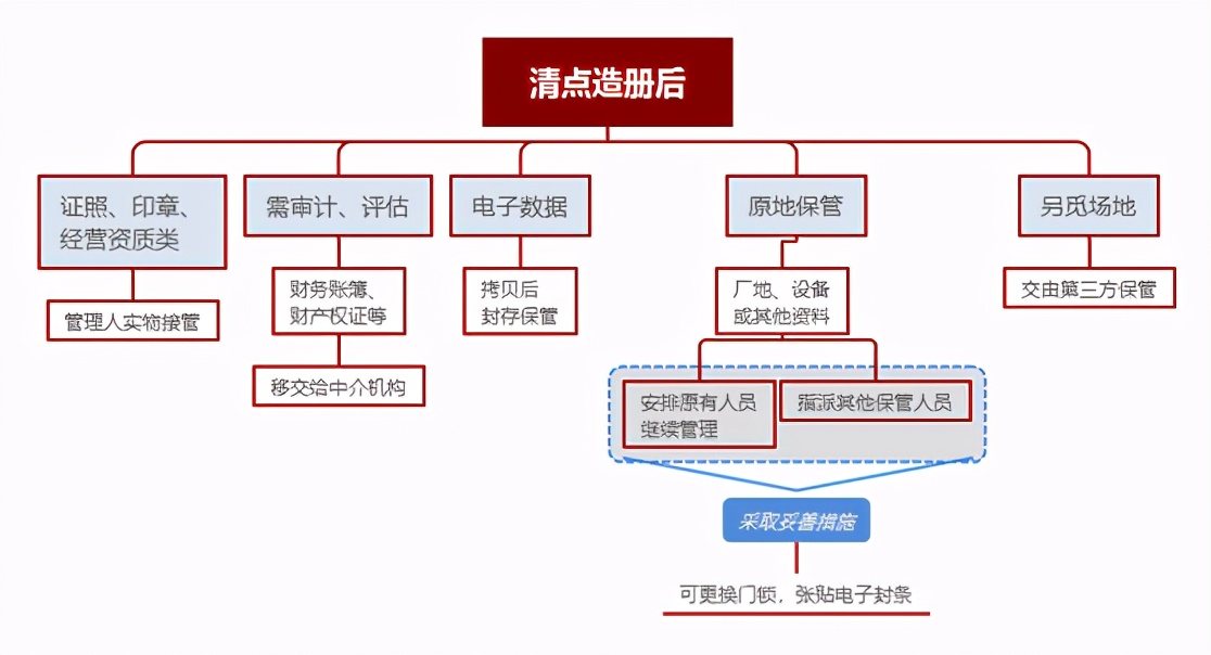 清点造册后,由人民法院、管理人、债务人相关人员进行确认,全部移交给管理人。证照、印章、经营资质等,管理人应实物接管。财务账簿、财产权证等可能需要中介机构进行审计、评估的,可移交给中介机构保管,若不需要移交,管理人也应实物接管。电子数据资料,应及时拷贝,并封存保管。