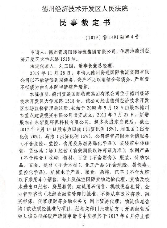 位于德州资通国际物流集团有限公司土地使用权一宗、房屋建筑物7项、构筑物及其他辅助设施14项、机器设备3台、电子设备及办公资产39项、存货-原材料2项、车辆5辆(详见标的物介绍)。