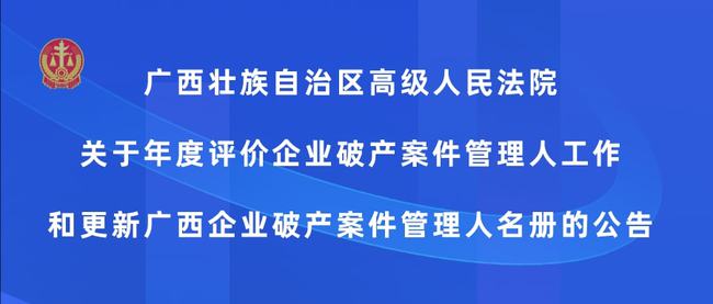 根据《中华人民共和国企业破产法》和《广西壮族自治区高级人民法院关于企业破产案件管理人工作评价办法》《广西壮族自治区高级人民法院关于企业破产案件管理人指定办法》,广西壮族自治区高级人民法院(以下简称“广西高院”)决定开展年度评价管理人工作和更新2020年度《广西企业破产案件管理人名册》(以下简称“《管理人名册》”)工作,年度评价实行评分制,名册更新包括新增、信息变动、级别调整、暂停资格或除名等事项。现就有关事宜公告如下: