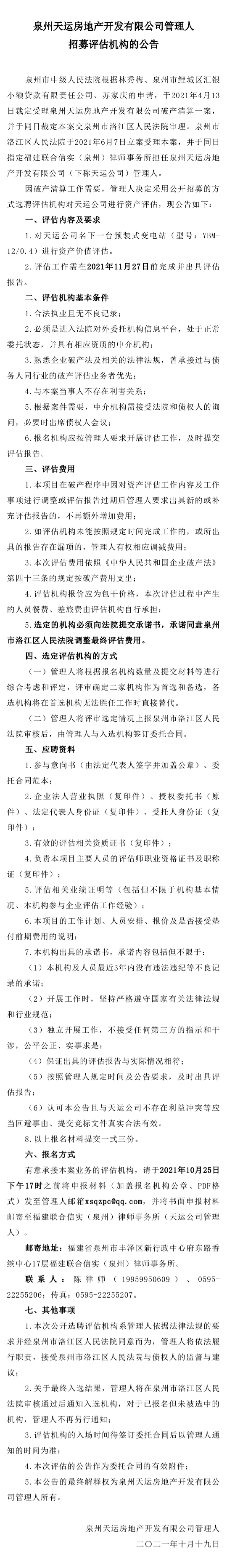 泉州天运房地产开发有限公司管理人招募评估机构的公告