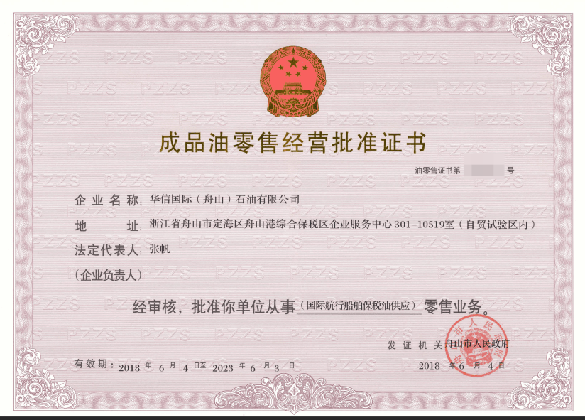 舟山华信是一家专业化公司,主营保税船用燃料油供应(贸易)业务。公司于2017年6月获得了国务院授权舟山市政府首批颁发的“保税船燃特许经营资质”,后续还相继取得了“港口经营许可”、“危化品经营许可”等一系列行业资质。