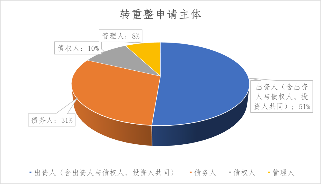 检索结果中,明确载明转重整申请主体的案例共39份(不含关联企业合并破产的重复文书),其中,由出资人或出资人联合其他主体(债权人、投资人等)申请转重整的案例20份,债务人自行申请转重整的案例12份,债权人单独申请转重整的案例4份,管理人申请转重整的案例3份。具体见下图: