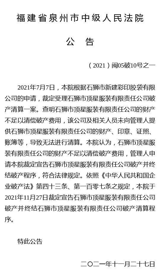 裁定宣告石狮市顶星服装有限责任公司破产并终结石狮市顶星服装有限责任公司破产清算程序