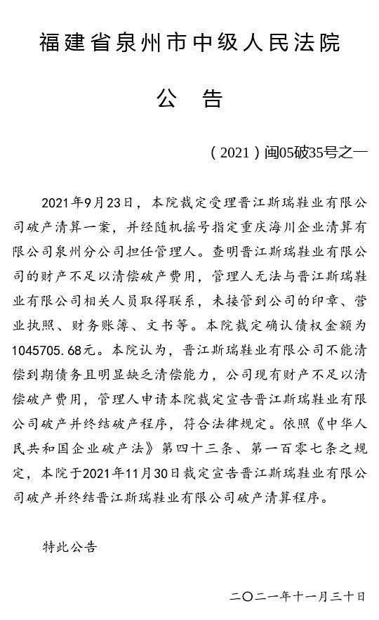 终结晋江斯瑞鞋业有限公司破产清算程序