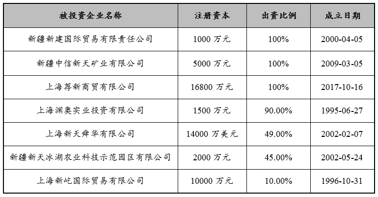 新天国际是一家集旅游、文化、房地产、能源、贸易、农业、海外合作等多元业务于一体的企业集团,对外长期股权投资12家境内企业和3家境外企业。其中,新天国际持有38,558,663股的西域旅游开发股份有限公司已于2020年8月6日在深交所上市(证券代码:300859);新天国际持有49%股权的上海新天舜华有限公司系位于上海黄浦江畔著名高档酒店——上海凯宾斯基酒店的产权单位。另外,3家境外企业分布在古巴、墨西哥,长期从事对外农业援助、旅游文化交流等项目。(注:西域旅游开发股份有限公司股票及海外资产不在本次重整资产范围内,重整资产范围详见下文)
