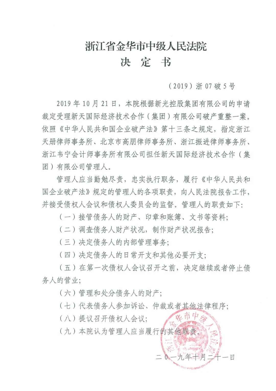 浙江省金华市中级人民法院于2019年10月21日裁定受理新天国际经济技术合作(集团)有限公司(以下简称“新天国际”)重整案件,并指定管理人。