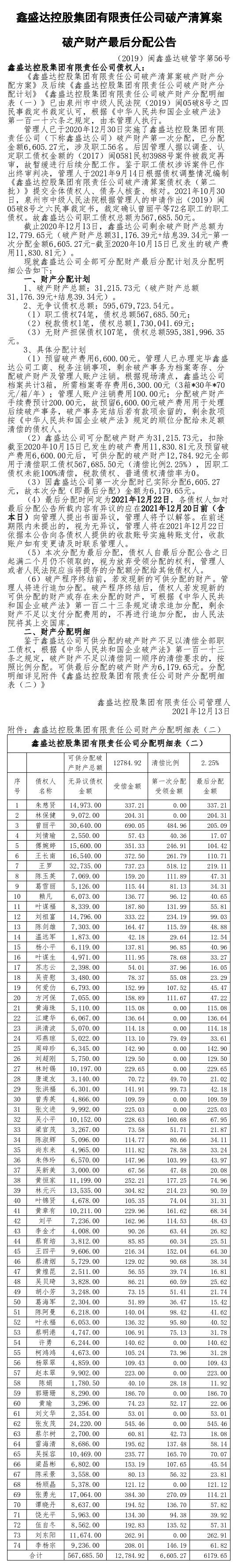 鑫盛达控股集团有限责任公司破产清算案破产财产最后分配公告