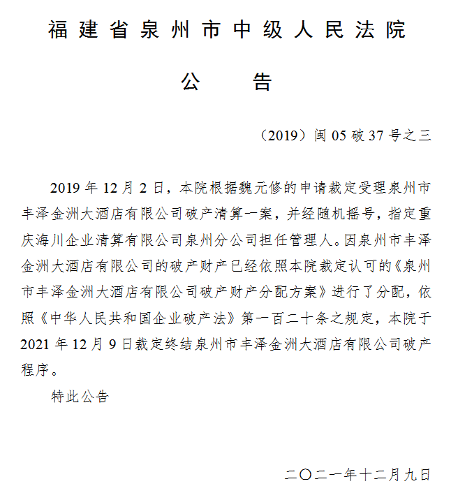 裁定终结泉州市丰泽金洲大酒店有限公司破产程序