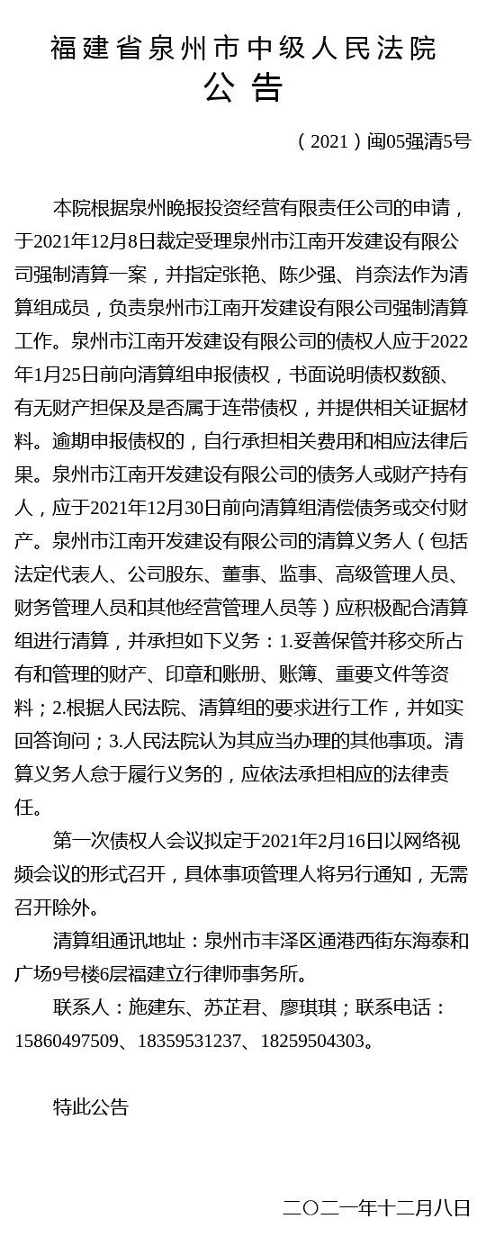 泉州市江南开发建设有限公司强制清算一案裁定受理公告