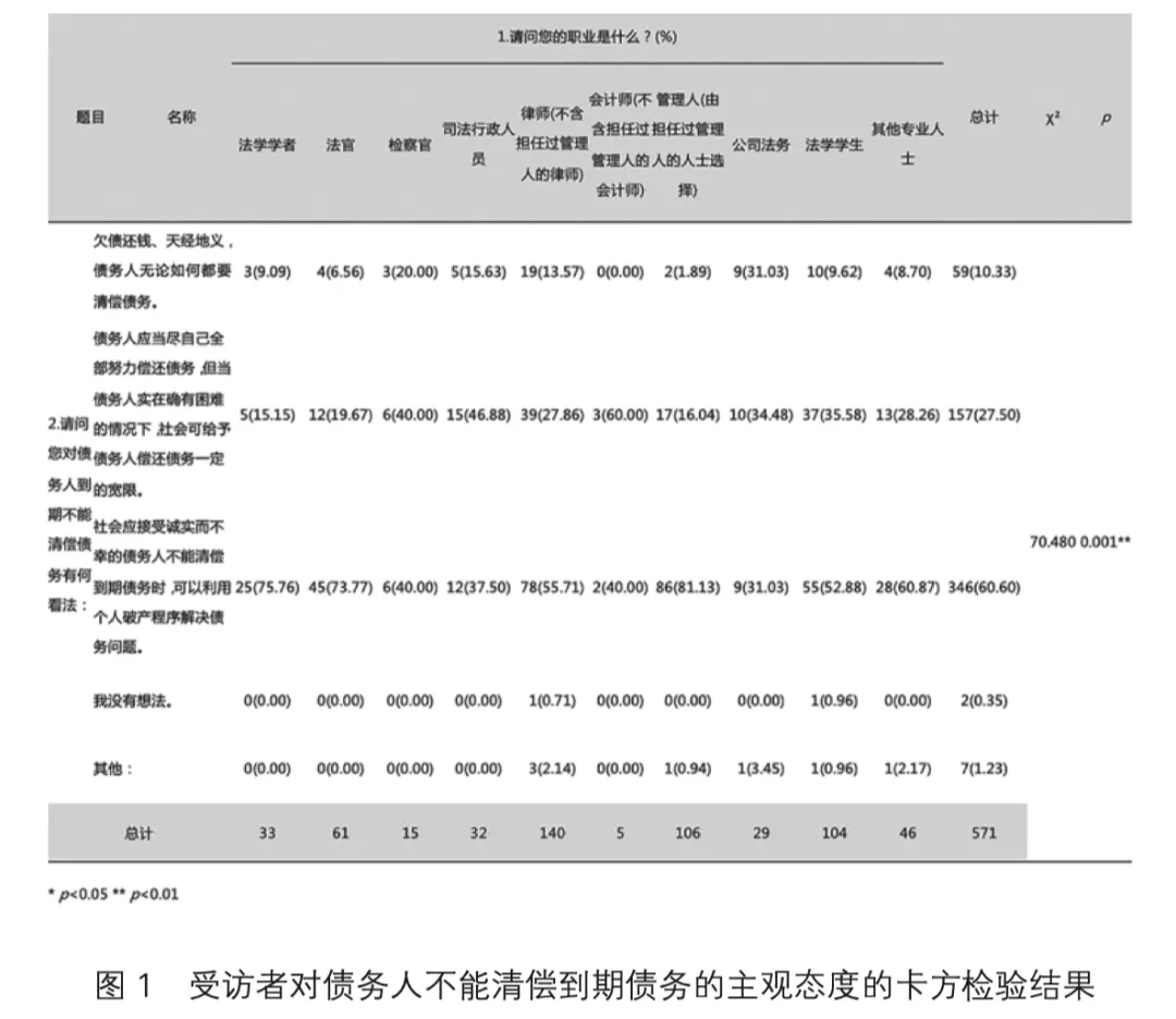 1、检验不同职业组别针对债务人不能清偿到期债务主观态度差异的结果
