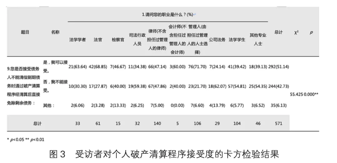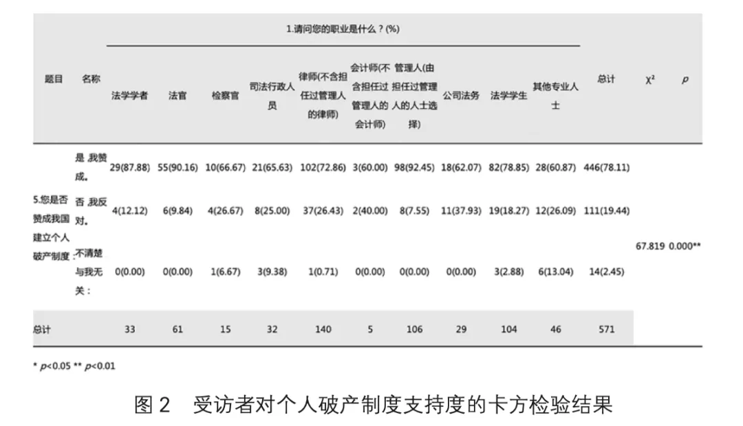 据图2可知,不同职业组别样本对于“是否赞成我国建立个人破产制度”呈现出显著性(ρ<0.05),意味着不同职业组别样本对于“是否赞成我国建立个人破产制度”均呈现出显著性差异。