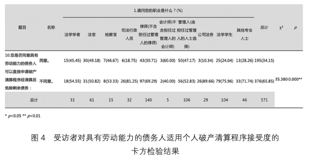 在不同职业组别选择的结果上,经SPSS交叉(卡方)检验可知,不同组别的受访者对个人破产制度的功能、我国未来个人破产法的立法目的、个人破产制度可能引发的社会风险、对待诚实而不幸债务人的态度、我国个人破产制度适用主体范围以及个人破产制度建立的程序模式等问题上与受访者整体的看法与态度基本保持一致,但是在对债务人不能清偿到期债务的主观态度、是否赞成建立个人破产制度、是否接受个人破产清算程序、是否接受有劳动能力的债务人适用个人破产清算程序以及是否接受个人破产和解程序等问题的选择上均与受访者整体的选择存在显著性差异。