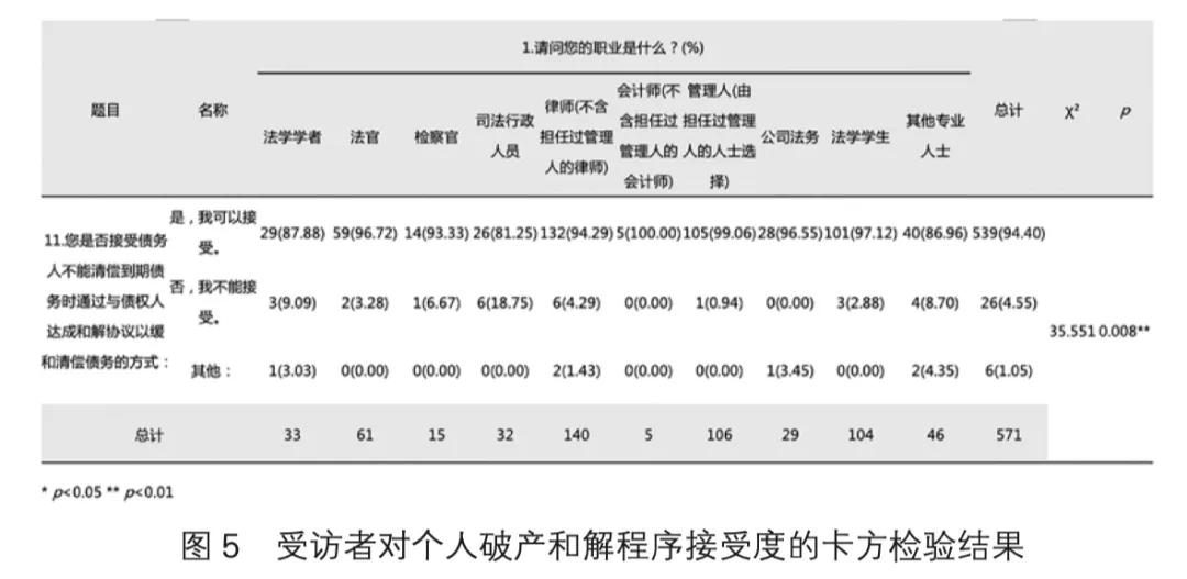 在获取受访者整体选择的数据之后,为了进一步探析不同职业组别的受访者对待个人破产制度的态度之差异,笔者将问卷数据导入SPSSAU(在线SPSS)系统进行检验。检验方法为将第1题即“请问您的职业是什么”作为X定类,将其他问题作为Y定类,进行交叉(卡方)检验。在分析结果上,如果所得ρ值大于0.05,则说明各个组别针对相同问题的选择结果与整体的选择不存在显著性差异,反之,如果所得ρ值小于0.05,则说明各个组别针对相同问题的选择结果与整体的选择存在显著性差异。