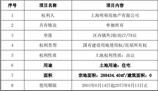 债务人的主要资产即坐落于上海市浦东新区临港综合区的土地使用权(以下简称“该地块”),具体情况如下表: