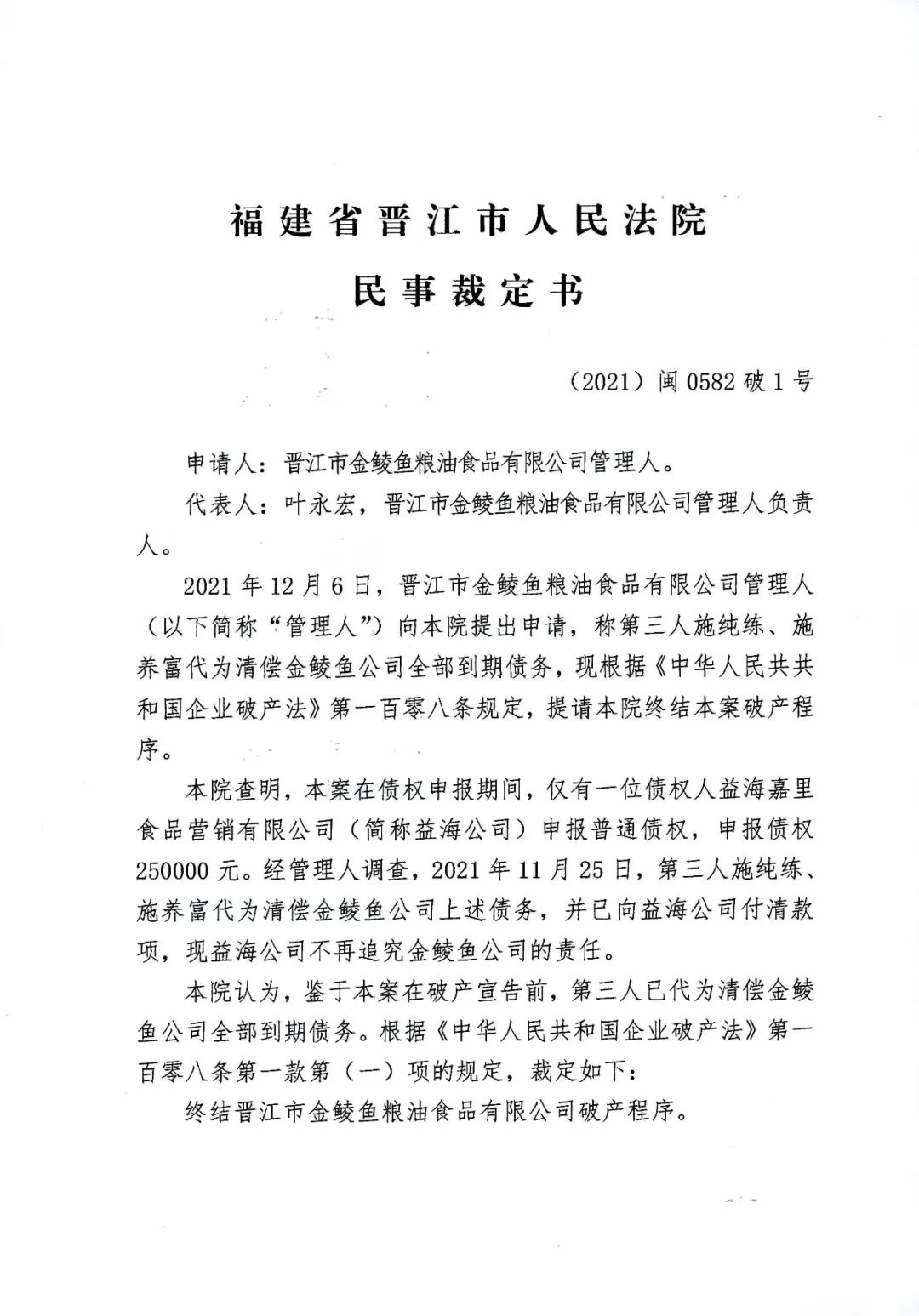 终结晋江市金鲮鱼粮油食品有限公司破产程序